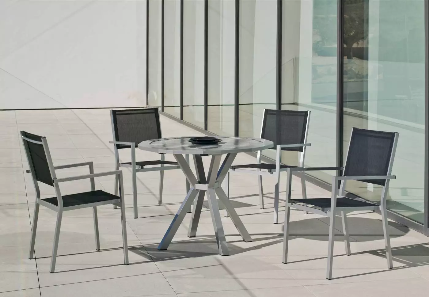 Su limpio y original diseño, otorgan a esta mesa de terraza hexagonal tanto modernidad como elegancia. Diseñada para soportar las condiciones adversas como el sol y la lluvia, así como los rigores del uso diario. La fabricamos en seis colores distintos; plata, blanco, marrón, negro, champán y gris antracita.