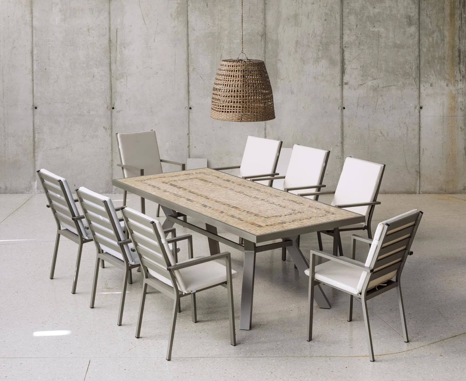 La forma rectangular de la mesa permite aprovechar al máximo el espacio disponible y es perfecta para utilizar en comedores, salones, cocinas y espacios exteriores. La superficie es resistente a manchas y arañazos, lo que facilita su mantenimiento y limpieza, y la estructura de aluminio brinda la estabilidad y robustez necesarias para soportar el uso diario.