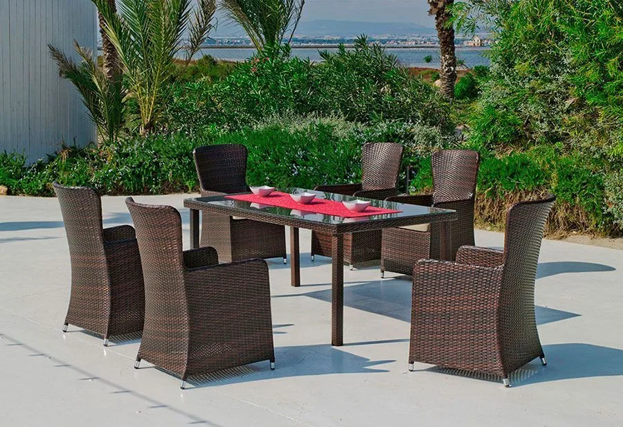 ¿Te gusta comer o cenar al aire libre? Con nuestra mesa de comedor de ratán marrón modelo Bahía, añadirás un toque clásico y distinto que no pasará desapercibido a la decoración de tu jardín o terraza. Fabricamos este modelo de mesa en dos tamaños distintos; 150×90 y 180×90 cm. Ideal para acoger hasta 8 comensales.