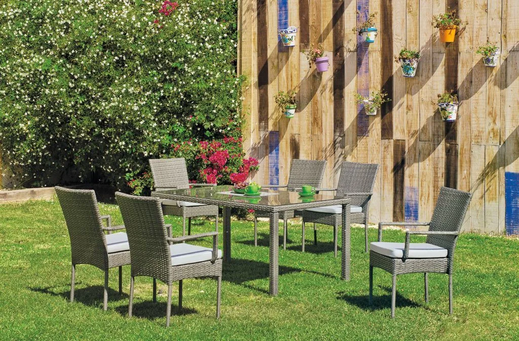 Práctica mesa de comedor rectangular para exterior en ratán gris Mali fabricada para soportar las condiciones adversas como el sol y la lluvia, así como los rigores del uso diario, ideal para jardín o terraza.