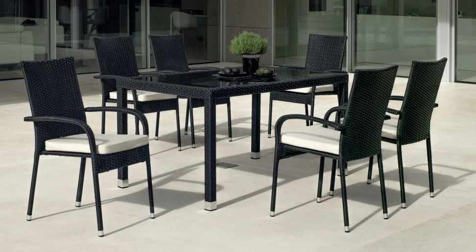 Práctica mesa de comedor rectangular en ratán negro Ampurias fabricada para soportar las condiciones adversas como el sol y la lluvia, así como los rigores del uso diario, ideal para jardín o terraza.