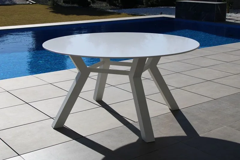 Original y práctica mesa redonda de comedor 150 cm. Fabricada en aluminio y tablero de Krion modelo Montblanc con acabado en color blanco. La fabricamos en dos diámetros distintos; 120 y 150 cm.
