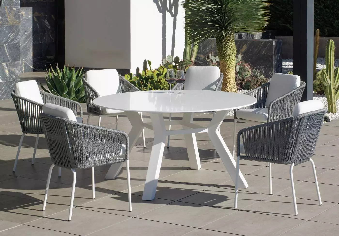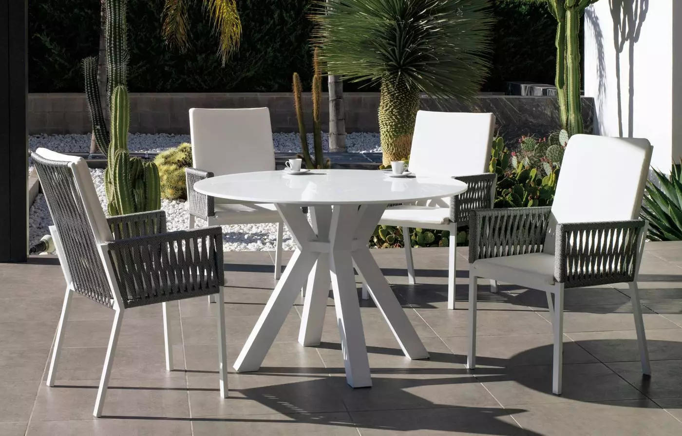 Esta mesa redonda de 150 cm diámetro con patas de líneas rectas y depuradas, de aspecto moderno y vanguardista, podrás combinarla con cualquiera de nuestras sillas o sillones de exterior logrando crear un espacio único en tu jardín o terraza. En el siguiente enlace puedes acceder al conjunto de exterior con sillones de cuerda.