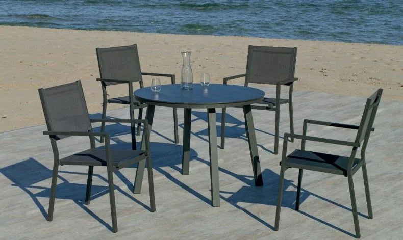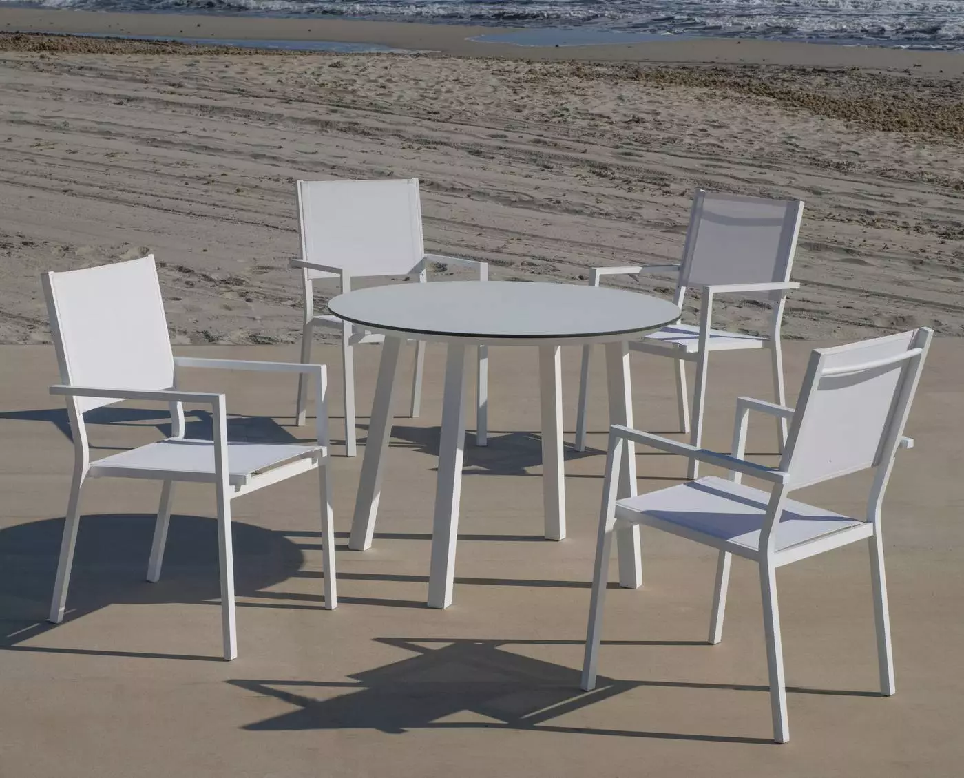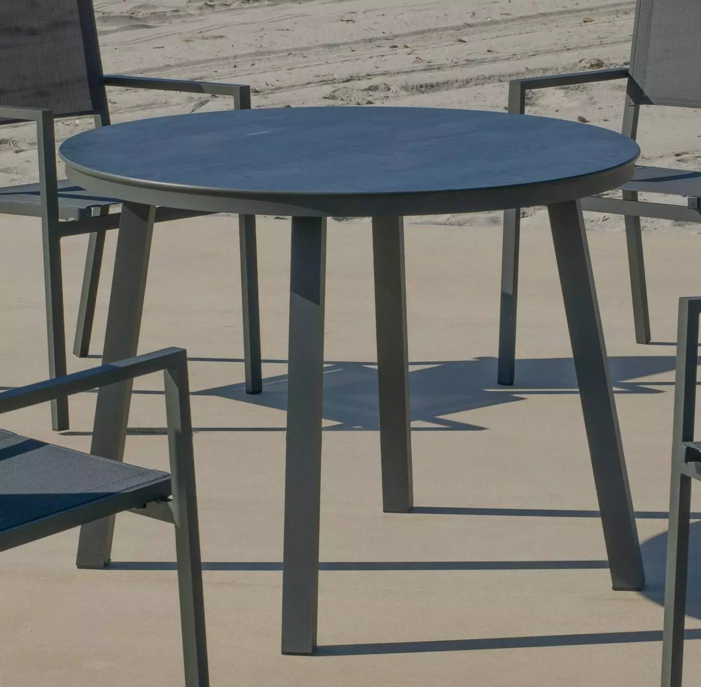 Original y práctica mesa de comedor redonda para exterior en aluminio y tablero HPL California con acabados en color blanco, plata, champagne o gris antracita y tablero laminado en HPL ultra resistente en varios acabados. La fabricamos en dos diámetros distintos; 100 y 120 cm.