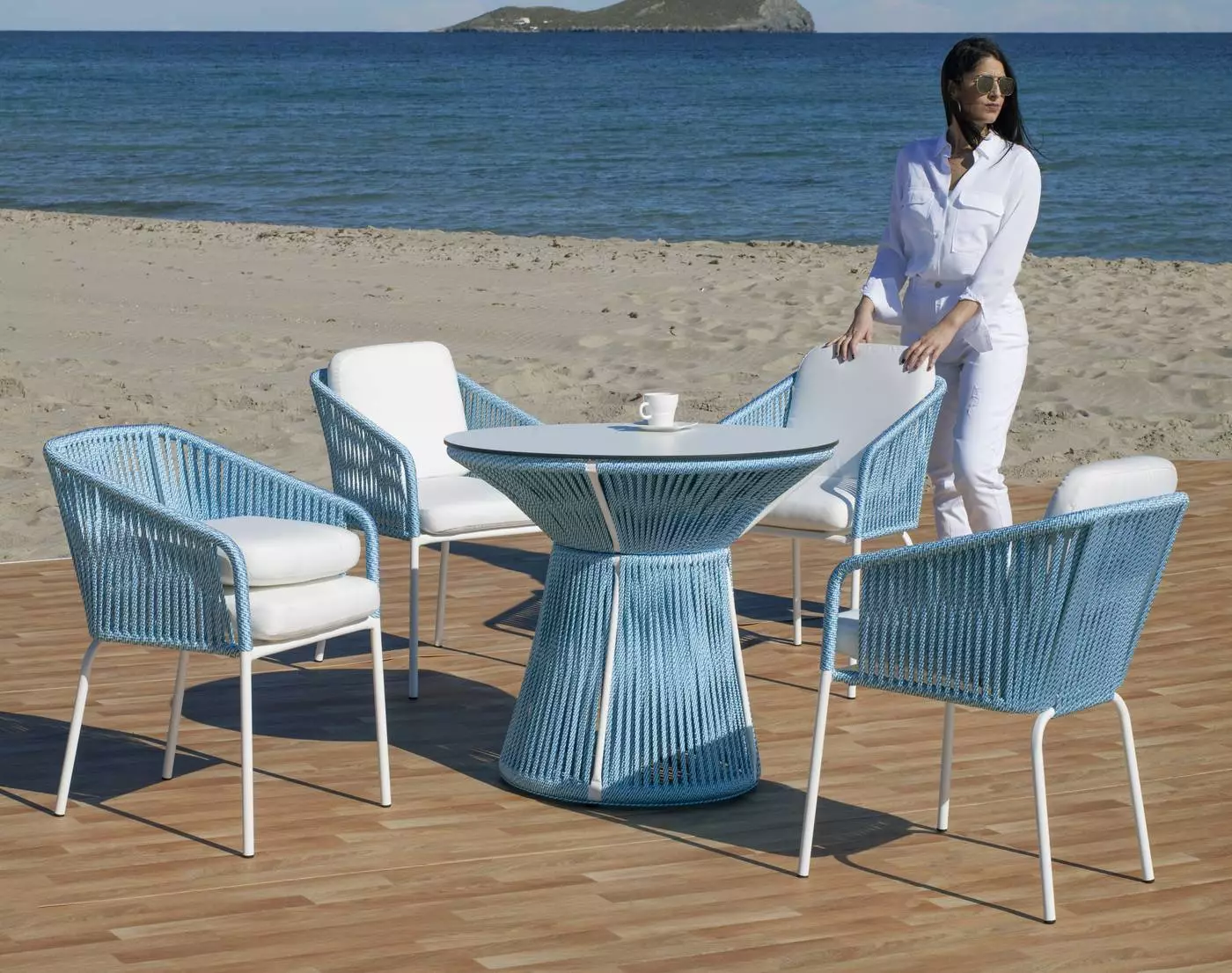 La estructura de aluminio esta mesa se complementa con unos elegantes detalles de cuerda trenzada en color champagne, azul, blanco o gris antracita y tapa de HPL en varios acabados.
