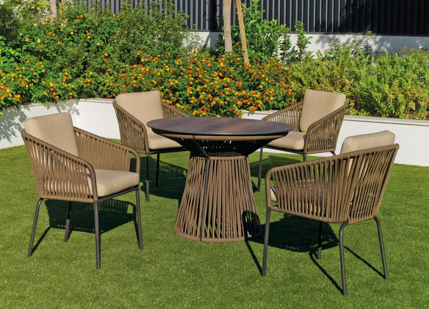 Esta elegante mesa redonda de comedor para jardín fabricada en aluminio y cuerda trenzada modelo Rodhos, te ofrecerá un lugar relajado y cómodo en tu jardín para que puedas disfrutar del tiempo libre con tu familia y amigos.