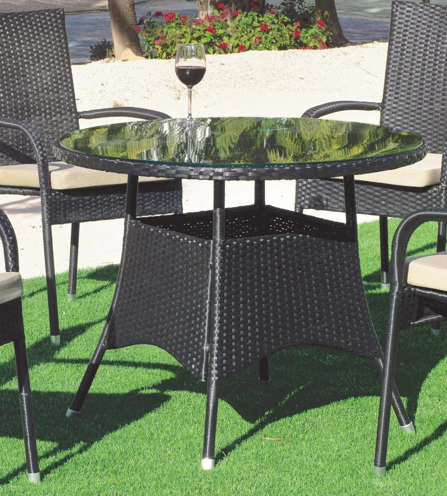 Práctica mesa de comedor redonda en ratán color grafito Ampurias fabricada para soportar las condiciones adversas como el sol y la lluvia, así como los rigores del uso diario, ideal para jardín o terraza.