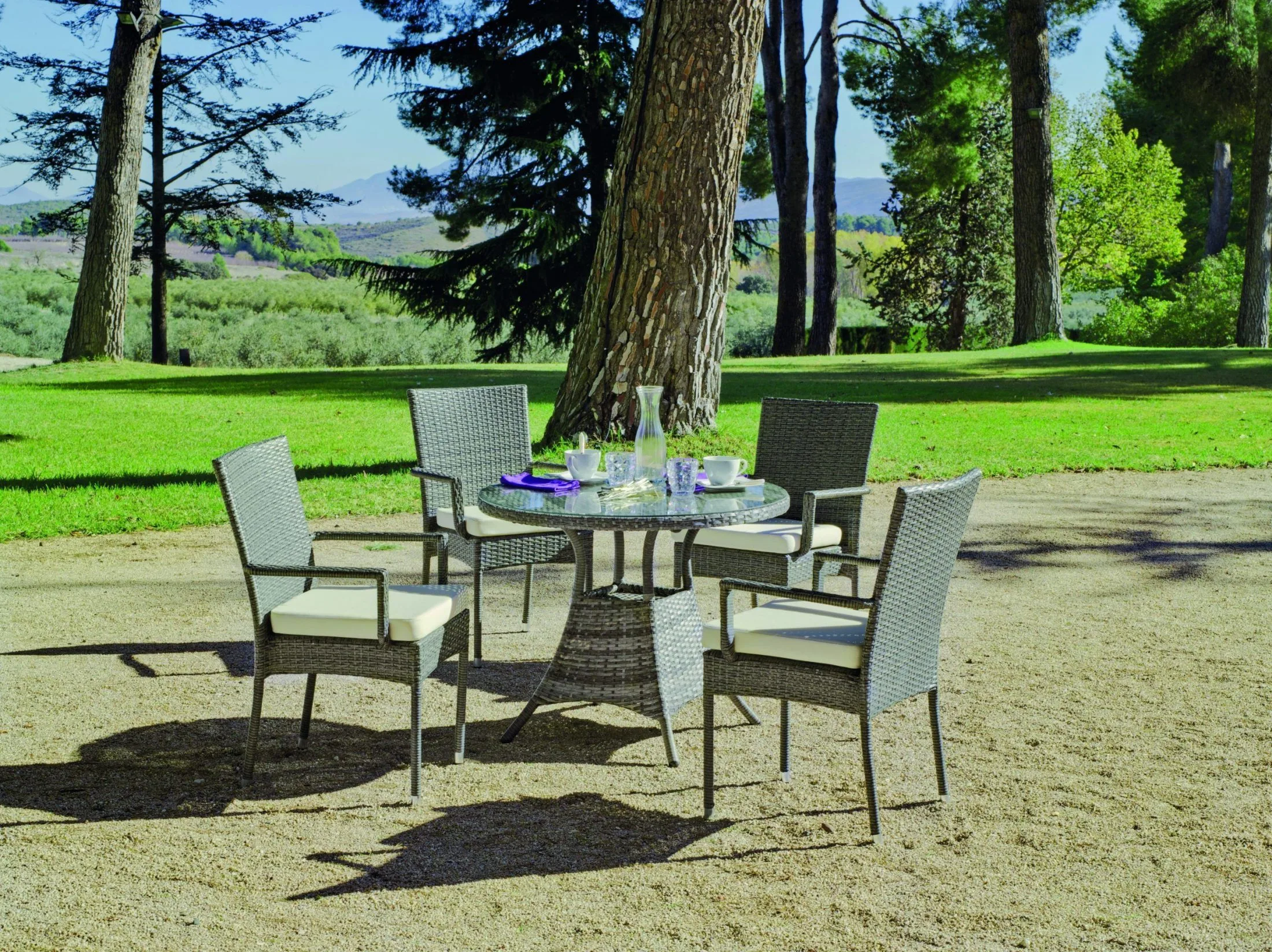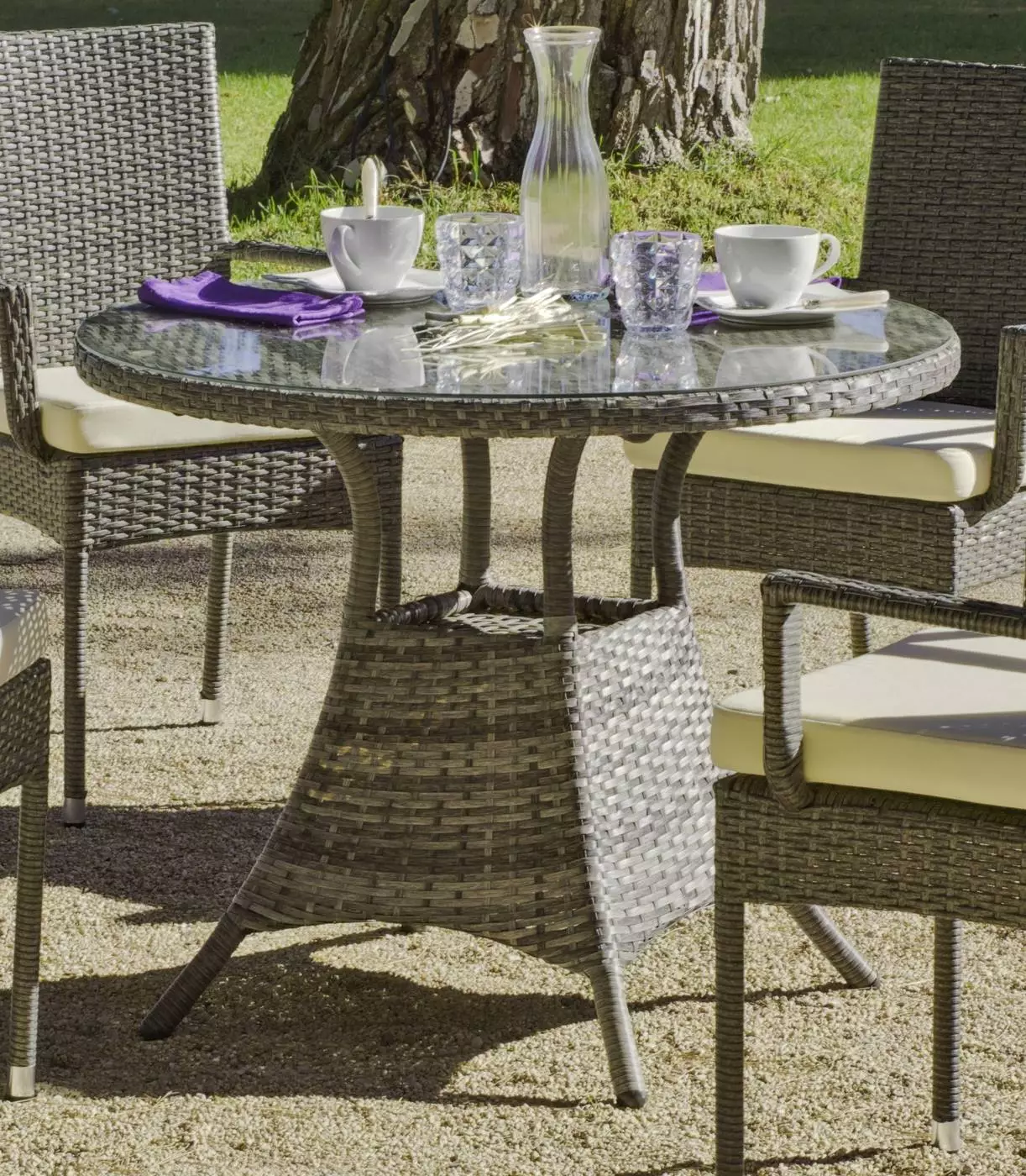 Práctica mesa de comedor redonda en ratán gris Mali fabricada para soportar las condiciones adversas como el sol y la lluvia, así como los rigores del uso diario, ideal para jardín o terraza.