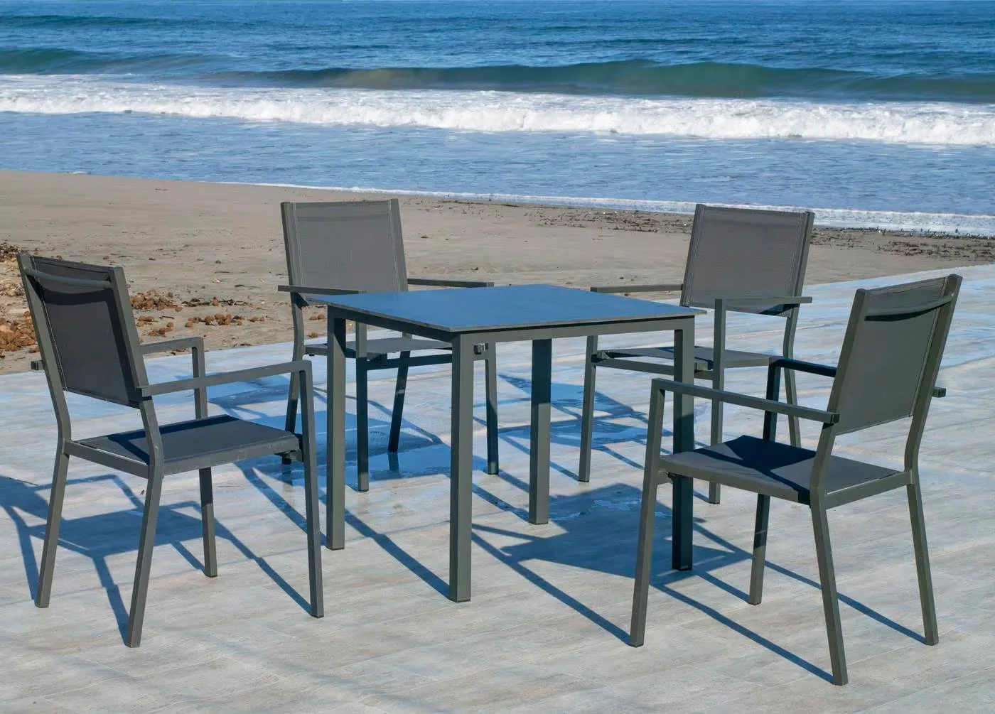 Nuestra mesa de exterior para 4 personas, esta fabricada con estructura de aluminio y tablero de HPL. Se presenta como una opción elegante y versátil para tu terraza o jardín.