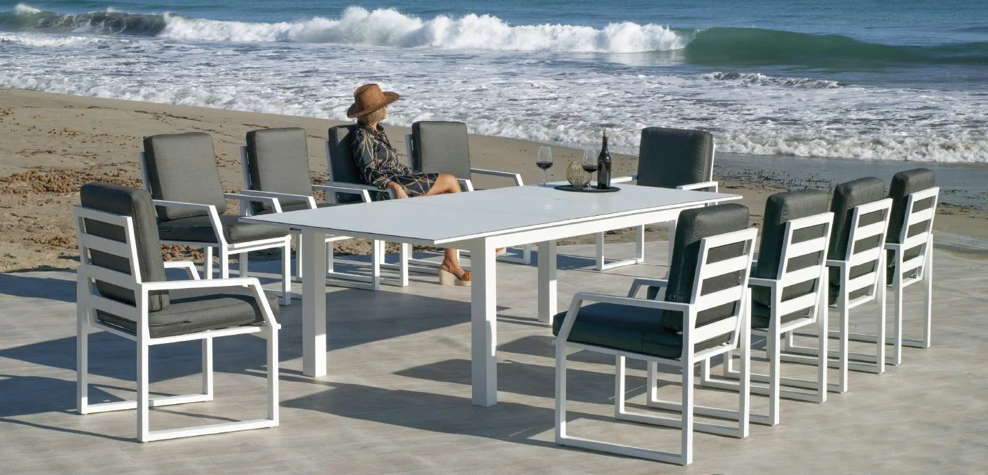 Mesa de terraza blanca extensible, con tablero rectangular de aluminio y tablero HPL con acabados en color blanco, champagne o gris antracita y tablero laminado en HPL ultra resistente.