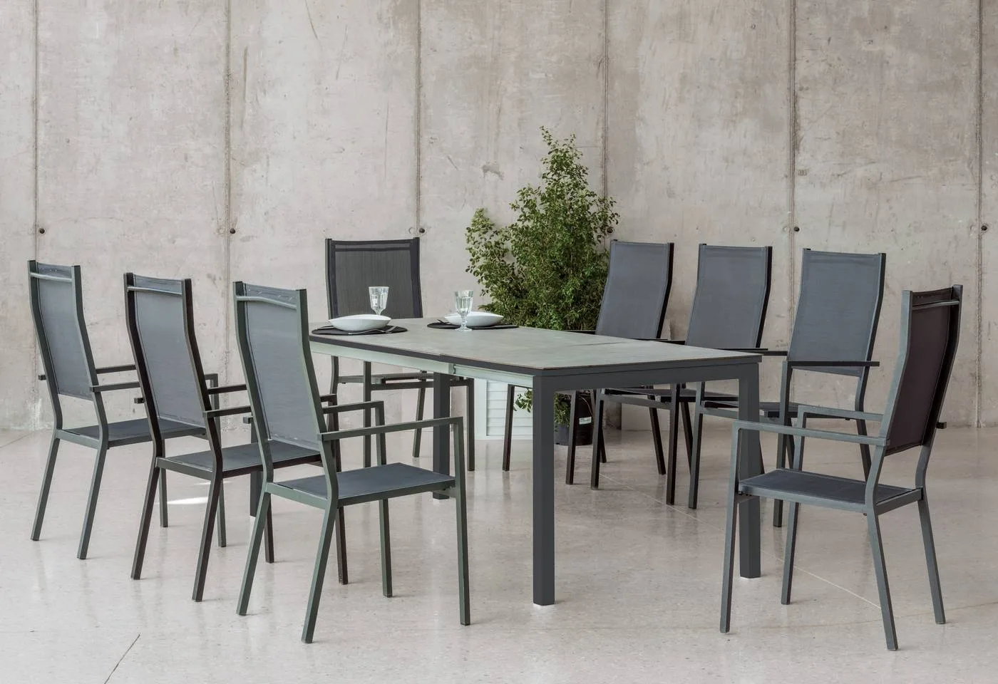 Descubre nuestra mesa extensible para exterior de aluminio, diseñada para jardines y terrazas. Con tapa de HPL resistente a rayaduras, humedad y rayos UV, ofrece dos tamaños: 150 cm (ampliable a 215 cm) y 200 cm (hasta 275 cm), perfecta para cenas íntimas o reuniones familiares.