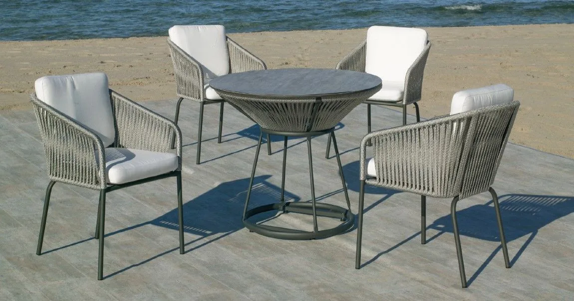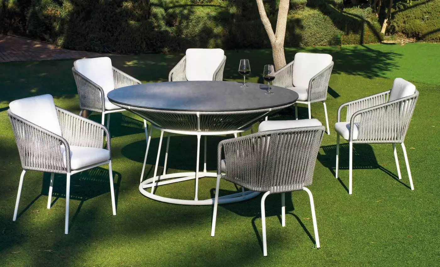 La estructura de aluminio esta mesa se complementa con unos elegantes detalles de cuerda trenzada en color champagne, azul, blanco o gris antracita y tapa de HPL en varios acabados.