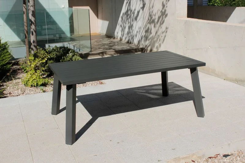 Fabricamos en aluminio y pintamos la estructura de este modelo de mesa rectangular de jardín en cuatro colores; champán, blanco, plata y gris antracita y en tres tamaños distintos. El tablero de la mesa de terraza rectangular está fabricado en lamas de aluminio. La mesa de jardín de aluminio rectangular está disponible en la medida que más se adapte a tu terraza, ya sea de 160×90 hasta 220×110. Aprovechamos este punto para recordar que fabricamos la mesa de exterior a la medida tanto de tablero como de patas que necesites.
