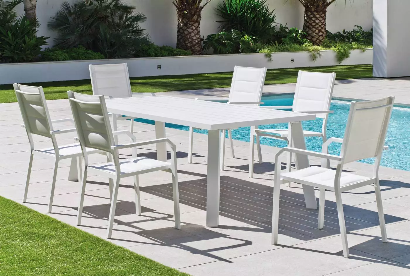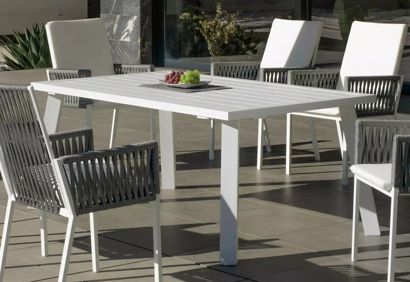 Su limpio y original diseño, otorgan a esta mesa de terraza rectangular tanto modernidad como elegancia. Diseñada para soportar las condiciones adversas como el sol y la lluvia, así como los rigores del uso diario. Fabricamos la estructura en tres colores; champagne, blanco y gris antracita y en tres tamaños distintos.