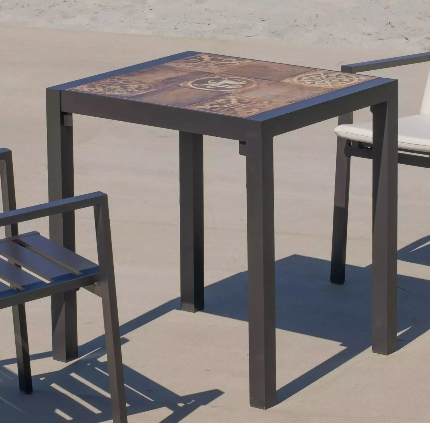 Decora tu jardín o terraza con esta práctica mesa mosaico cuadrada color marrón Modelo Lomba, con tablero en dos tamaños distintos; 60 x 60 y 80 × 80 cm. Una mesa muy resistente fabricada para soportar las condiciones adversas como el sol y la lluvia, así como los rigores del uso diario, ideal para jardín o terraza.