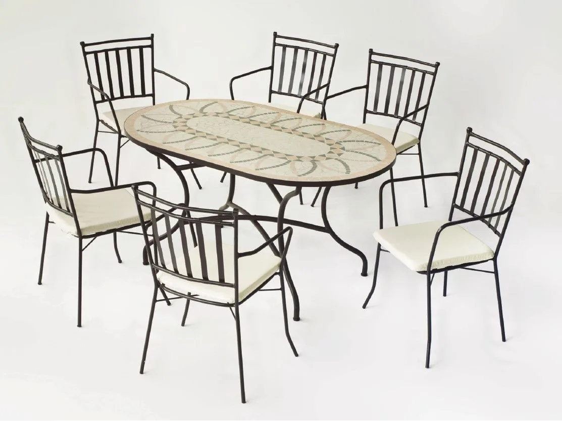 Esta mesa mosaico ovalada de elegante diseño, creará un ambiente mediterráneo en tu hogar. Su patrón de mosaico, de figuras geométricas, hecho a mano es particularmente único y le darán un estilo personal a tu terraza o jardín.
