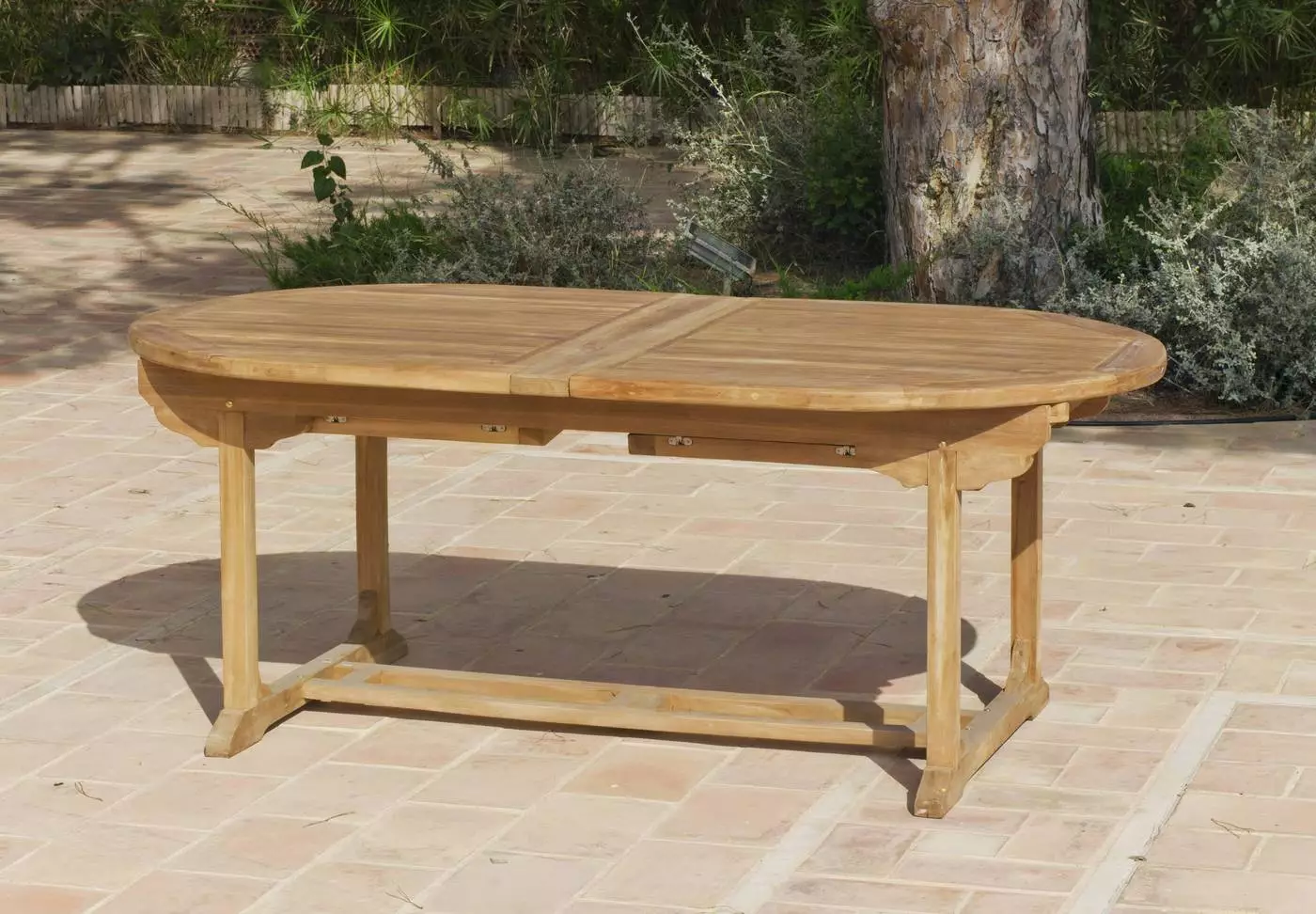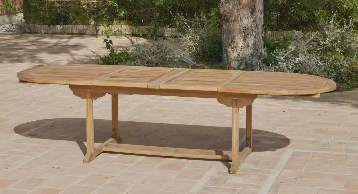Con nuestra mesa ovalada extensible en madera de teka Amberes, añadirás un toque clásico y distinto que no pasará desapercibido a la decoración de tu jardín o terraza. Su amplia superficie será ideal para tomar el aperitivo o comida en compañía de familiares o amigos, ya que es extensible de 180 a 300 cm.