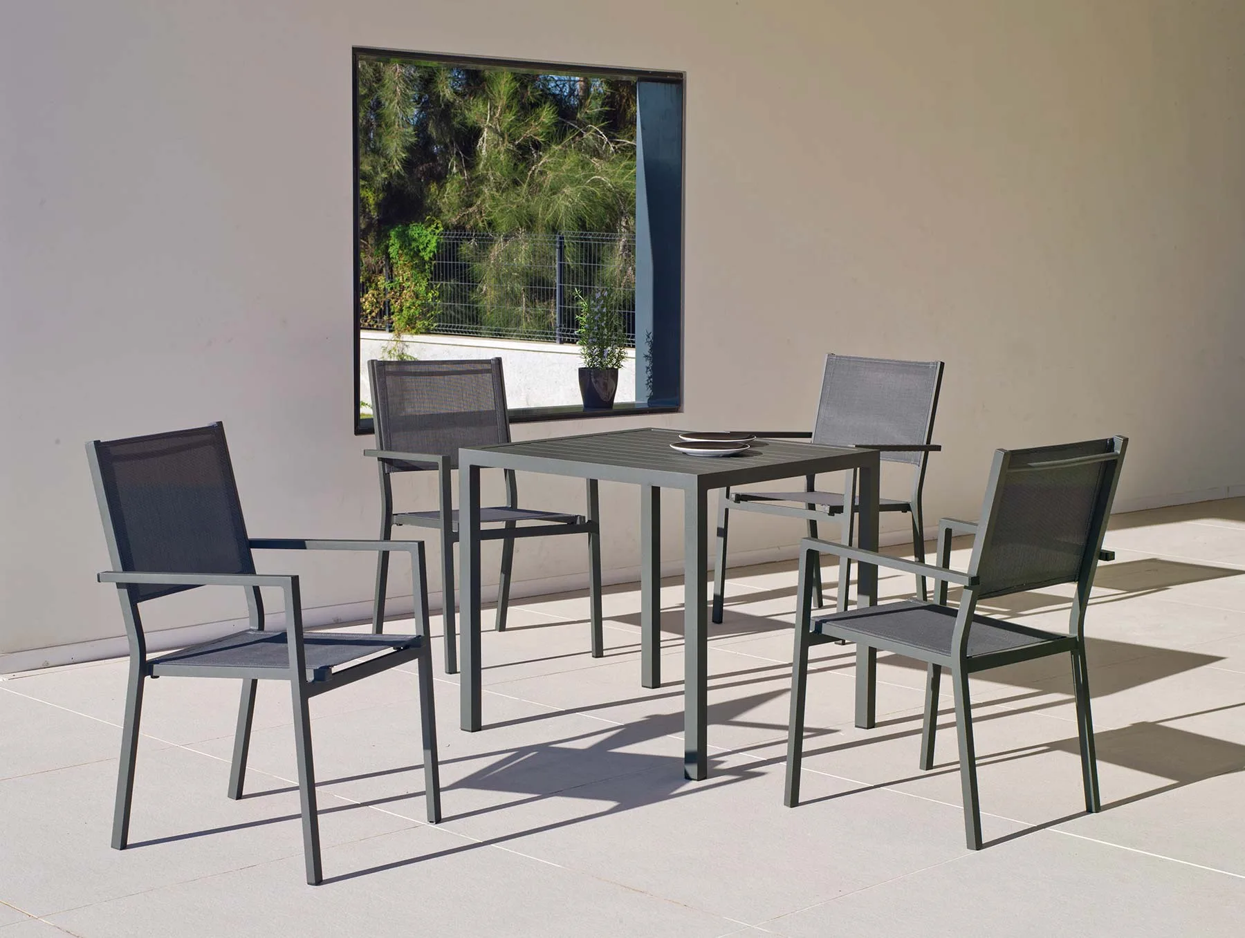Transforma tu balcón en un espacio acogedor y elegante con nuestro set de muebles de exterior. Consta de una mesa cuadrada de aluminio de 80 cm. de lado, acompañada por cuatro sillas también de aluminio con asientos de textilene. Este conjunto combina a la perfección funcionalidad y estilo para brindarte momentos inolvidables al aire libre.