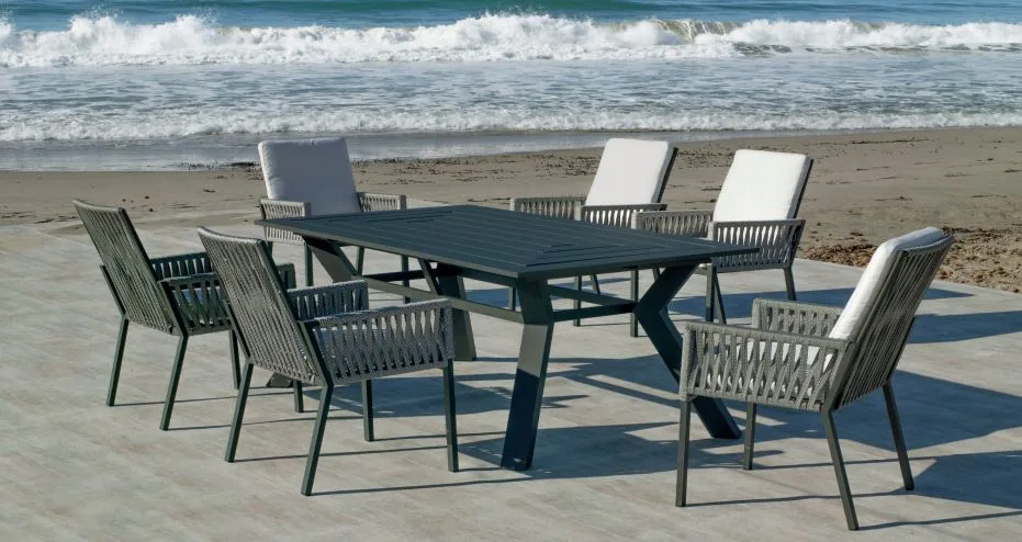 Descubre nuestro exclusivo conjunto de muebles de jardín con mesa de aluminio y 6 sillas con cuerda náutica y cojines Dralón.