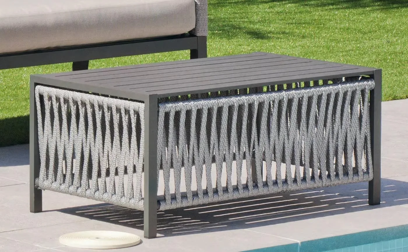 La estructura de este conjunto está revestida de cuerdas trenzadas en color champagne, azul, blanco o gris antracita. Se trata de una cuerda indeformable e irrompible, resistente a cualquier temperatura. No pierde su forma ni color y está diseñada 100% para su uso en exterior.