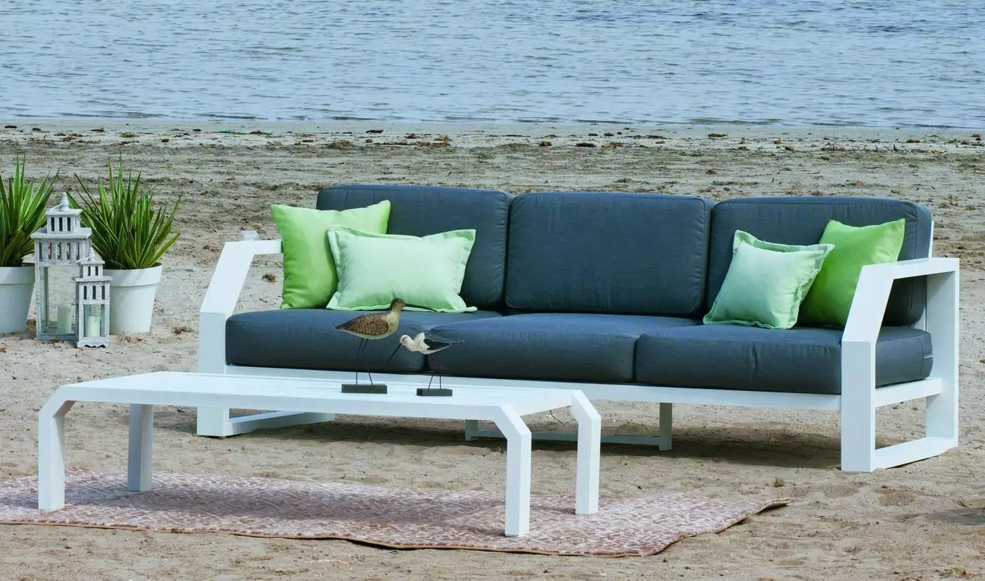 Set de sofás para exterior fabricado en aluminio compuesto por 1 cómodo sofá de tres plazas, 2 elegantes sillones con sus respectivos reposapiés y una cómoda mesa a juego. De elegante diseño y con una robusta estructura diseñada para proporcionar comodidad, es la mejor opción para relajarse, leer un libro o descansar.