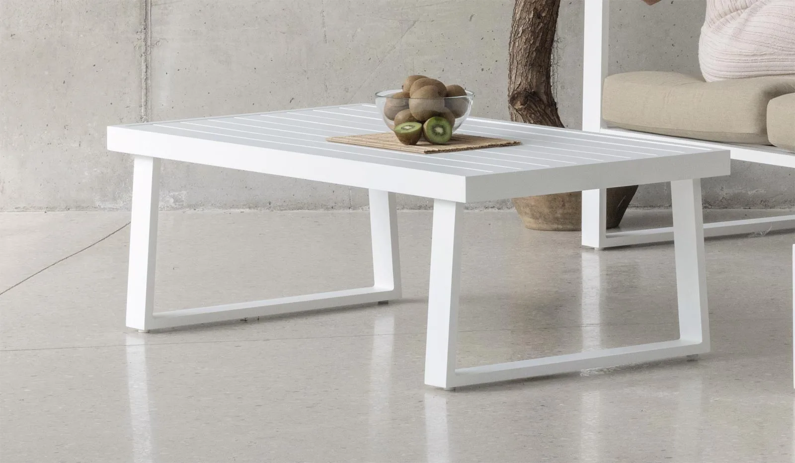 - 1 Mesa de centro de aluminio. Dimensiones (Ancho-Fondo-Alto): 125 x 65 x 40 cm.