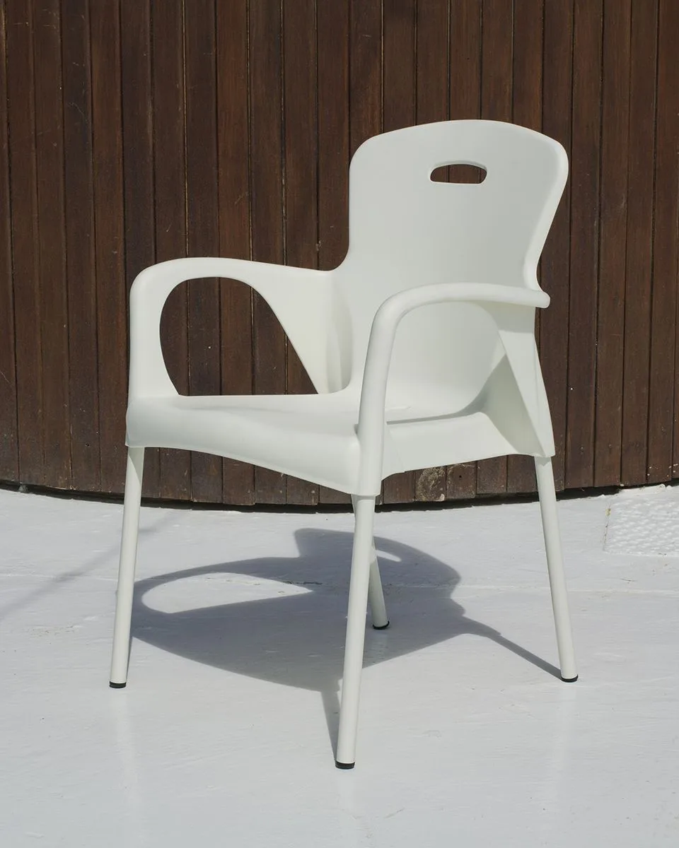 Nuestra silla apilable de acero y resina color crema para patio está diseñada para brindarte el máximo confort mientras disfrutas del sol y la brisa. Su asiento y respaldo están hechos de resina de alta calidad, resistente a los rayos UV y a la intemperie