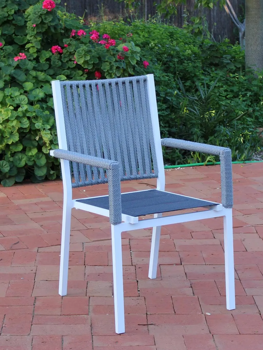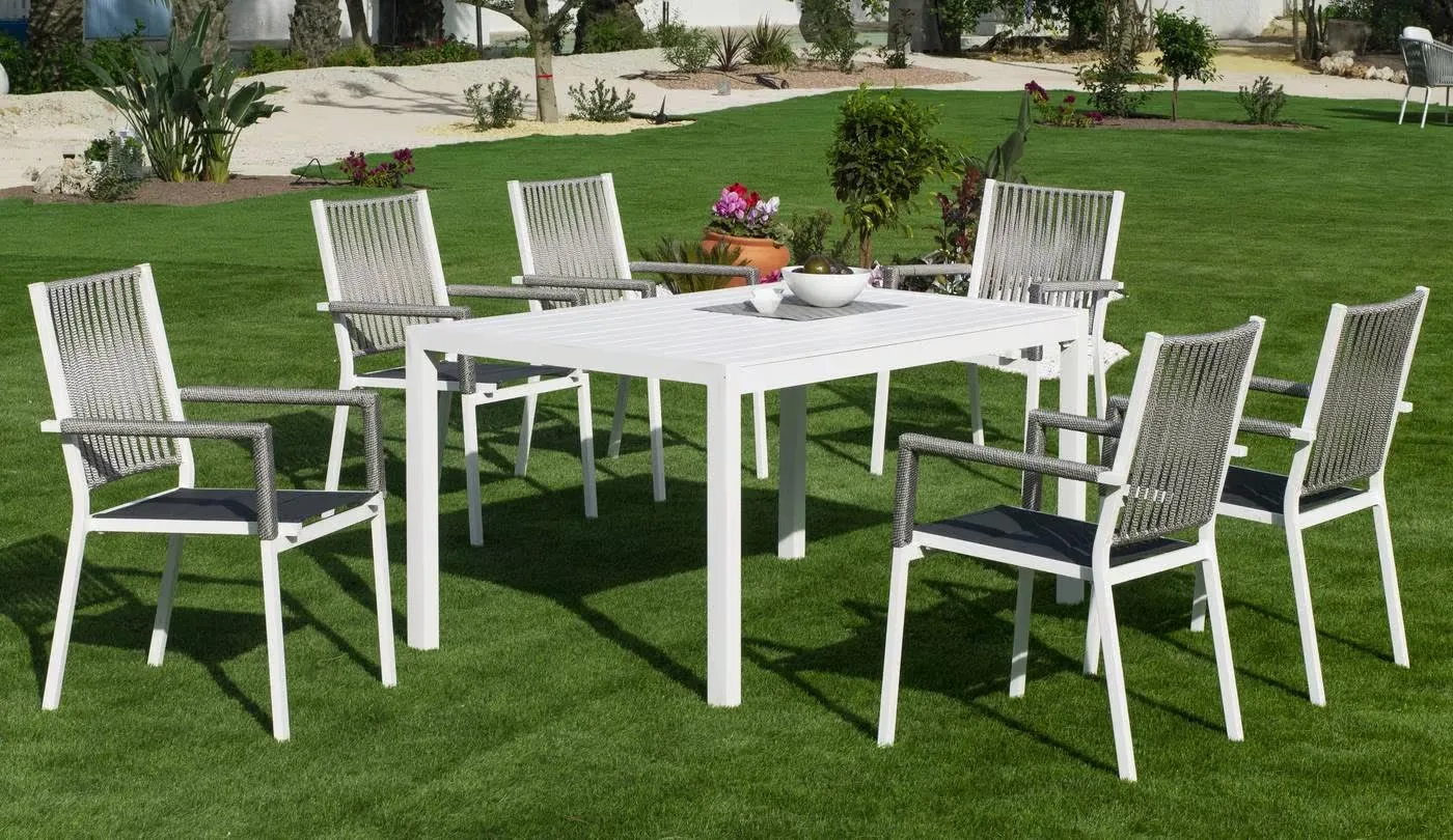 La estructura de esta silla se complementa con un respaldo de cuerdas trenzadas en color champagne, azul, blanco o gris antracita. Se trata de una cuerda indeformable e irrompible, resistente a cualquier temperatura. No pierde su forma ni color y está diseñada 100% para su uso en exterior.