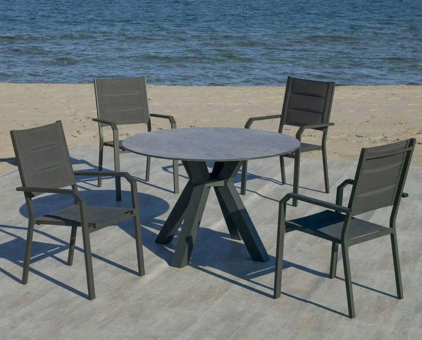 Su limpio y original diseño, otorgan a este conjunto de exterior modernidad y elegancia. Especialmente diseñado para soportar las condiciones adversas como el sol y la lluvia, así como los rigores del uso diario. Fabricamos la estructura en seis colores distintos; champagne, blanco, marrón, negro, plata y gris antracita.