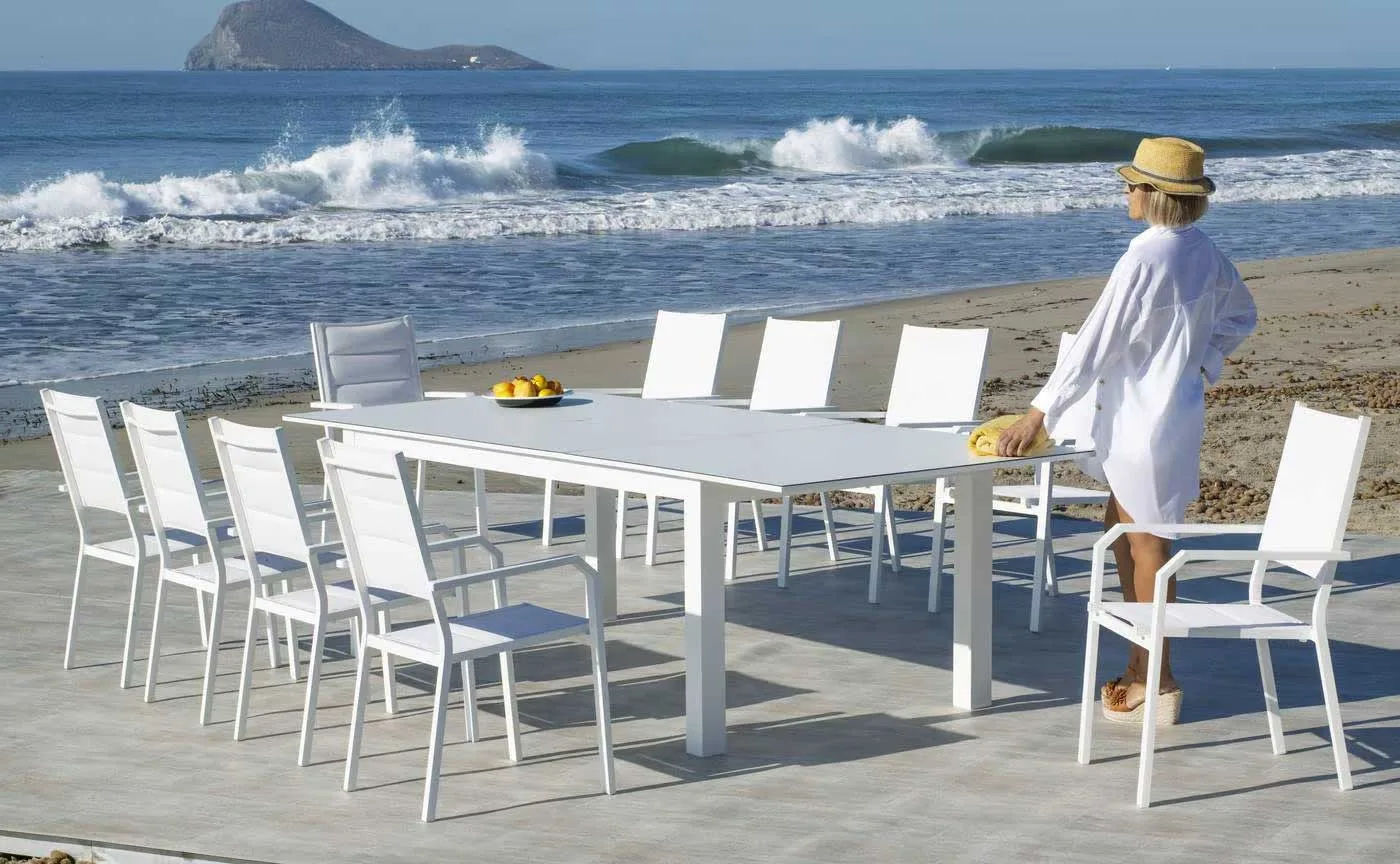 En la fabricación de este set de exterior, se han utilizado las mejores materias primas que la hacen muy resistente y duradera. Estructura y uniones fabricadas en aluminio extrusado de alta calidad y no reciclado. Los tubos de aluminio que la forman están perfectamente lijados para eliminar cualquier imperfección o irregularidad en las juntas. Así mismo, dichos tubos están especialmente pulidos para abrir los poros del aluminio y facilitar la fijación de la pintura. Las patas llevan tacos para evitar rallar el suelo y reducir el ruido producido con el movimiento.