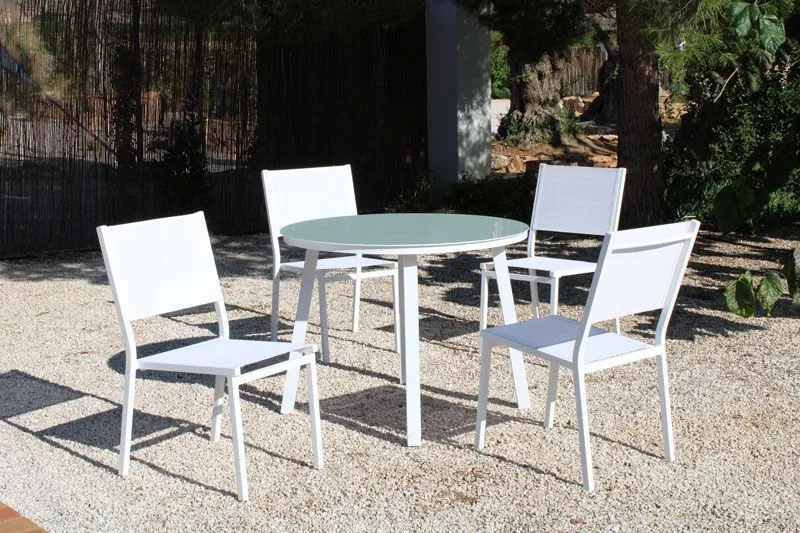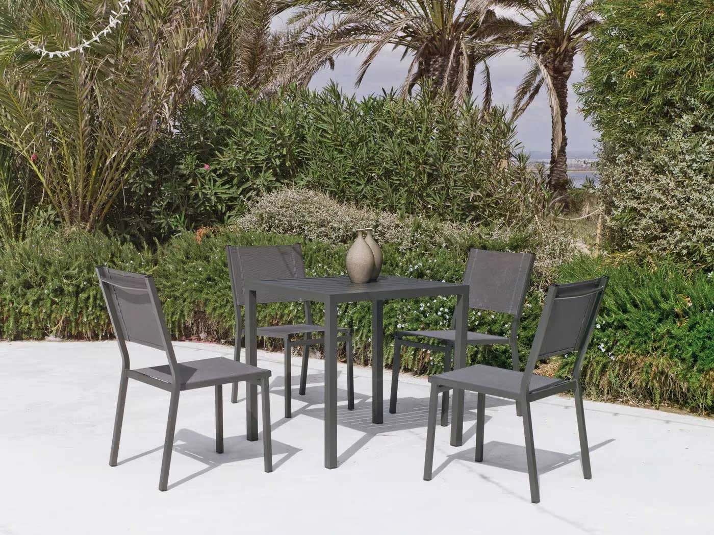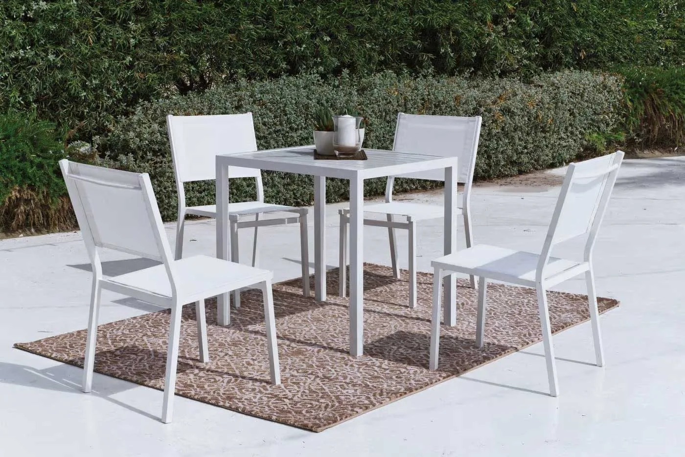 Puedes combinar este modelo de silla de terraza sin brazos con nuestra mesa de comedor de aluminio Córcega.