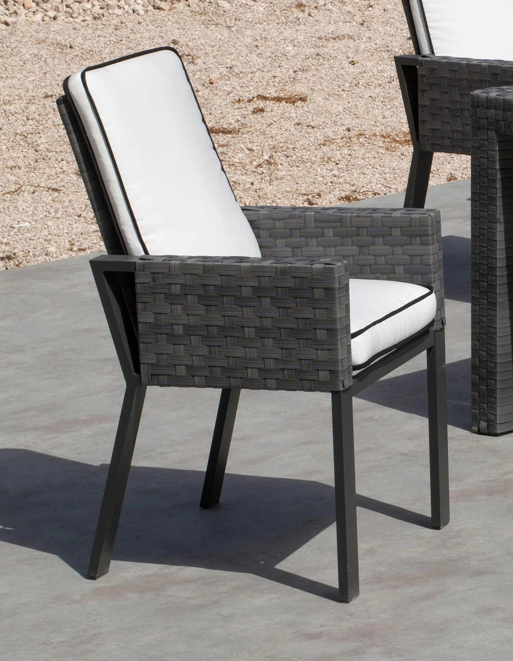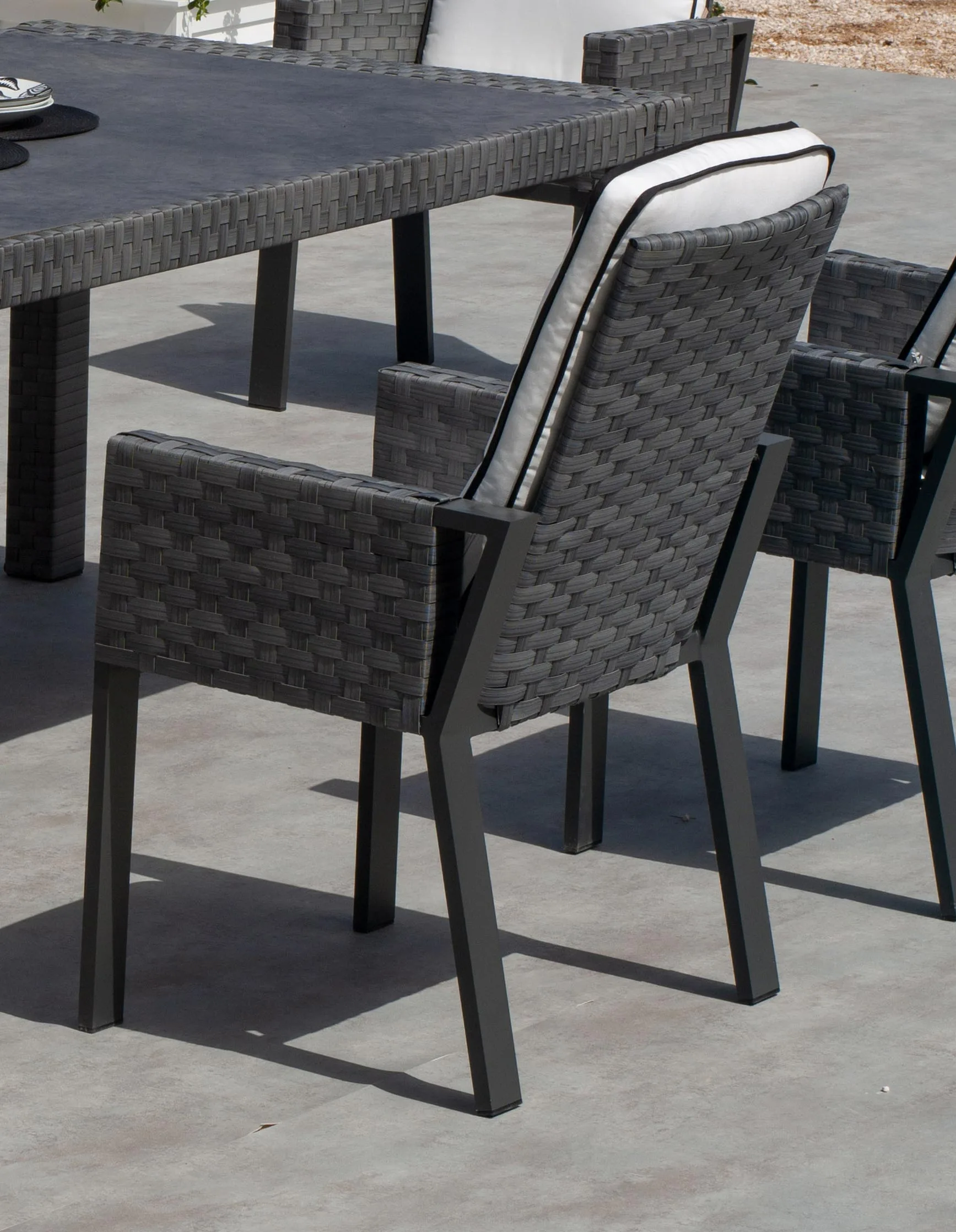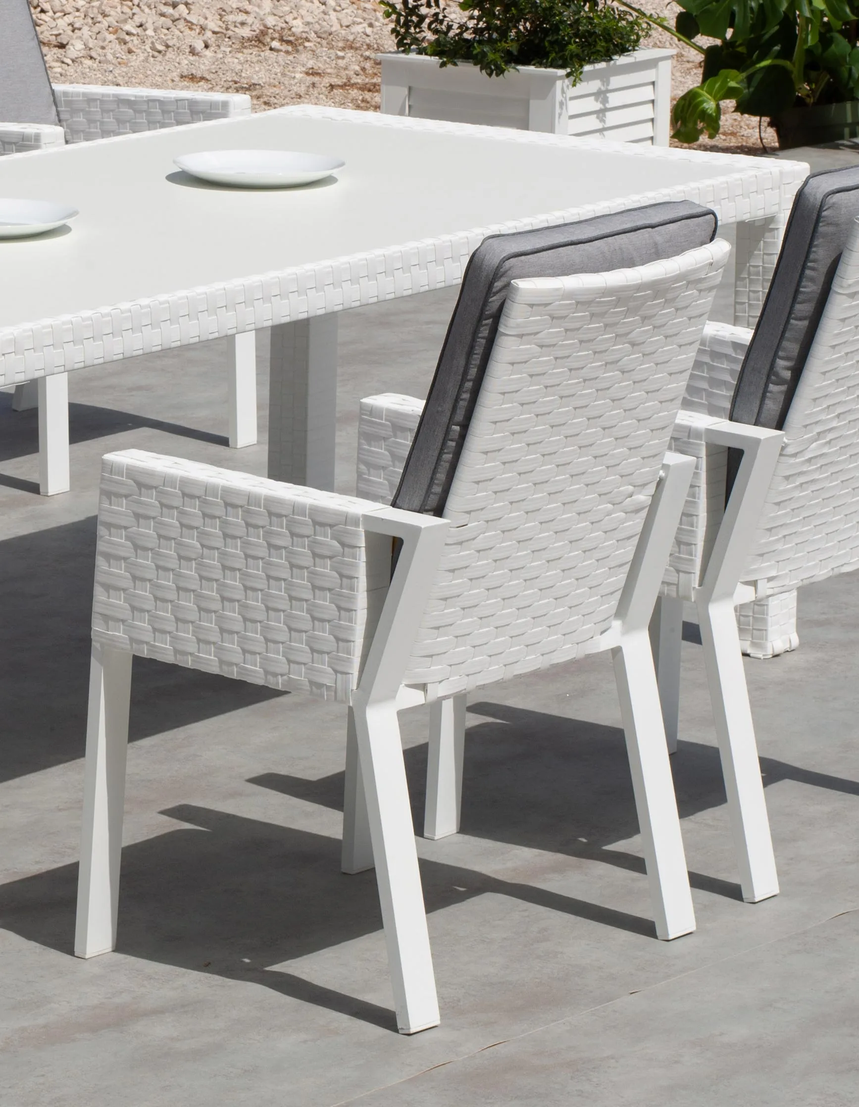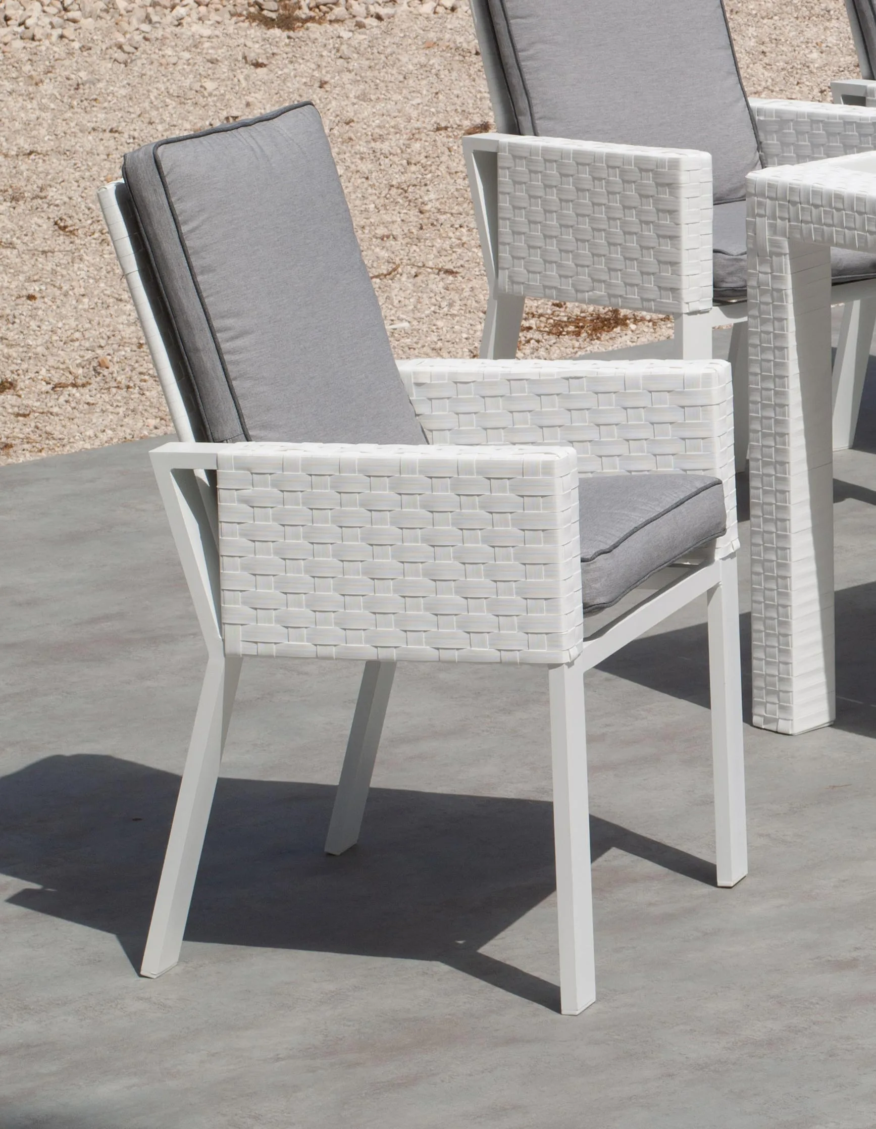 Asiento y respaldo en ratán sintético resistente a la intemperie.