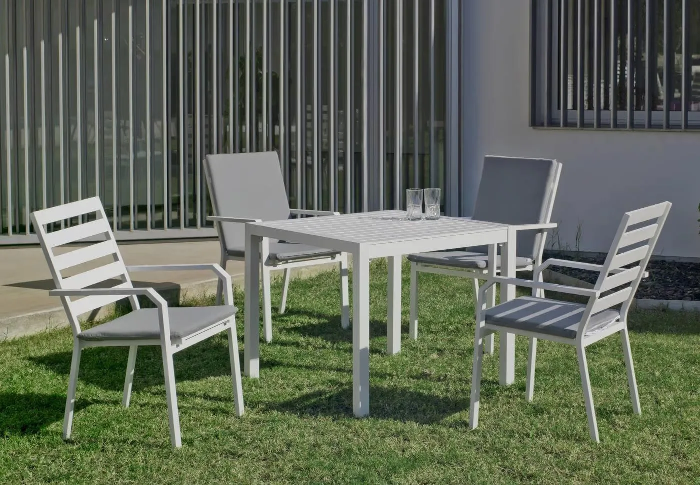 En la fabricación de este set de exterior, se han utilizado las mejores materias primas que la hacen muy resistente y duradera. Estructura y uniones fabricadas en aluminio extrusado de alta calidad y no reciclado. Los tubos de aluminio que la forman están perfectamente lijados para eliminar cualquier imperfección o irregularidad en las juntas. Así mismo, dichos tubos están especialmente pulidos para abrir los poros del aluminio y facilitar la fijación de la pintura. Las patas llevan tacos para evitar rallar el suelo y reducir el ruido producido con el movimiento.