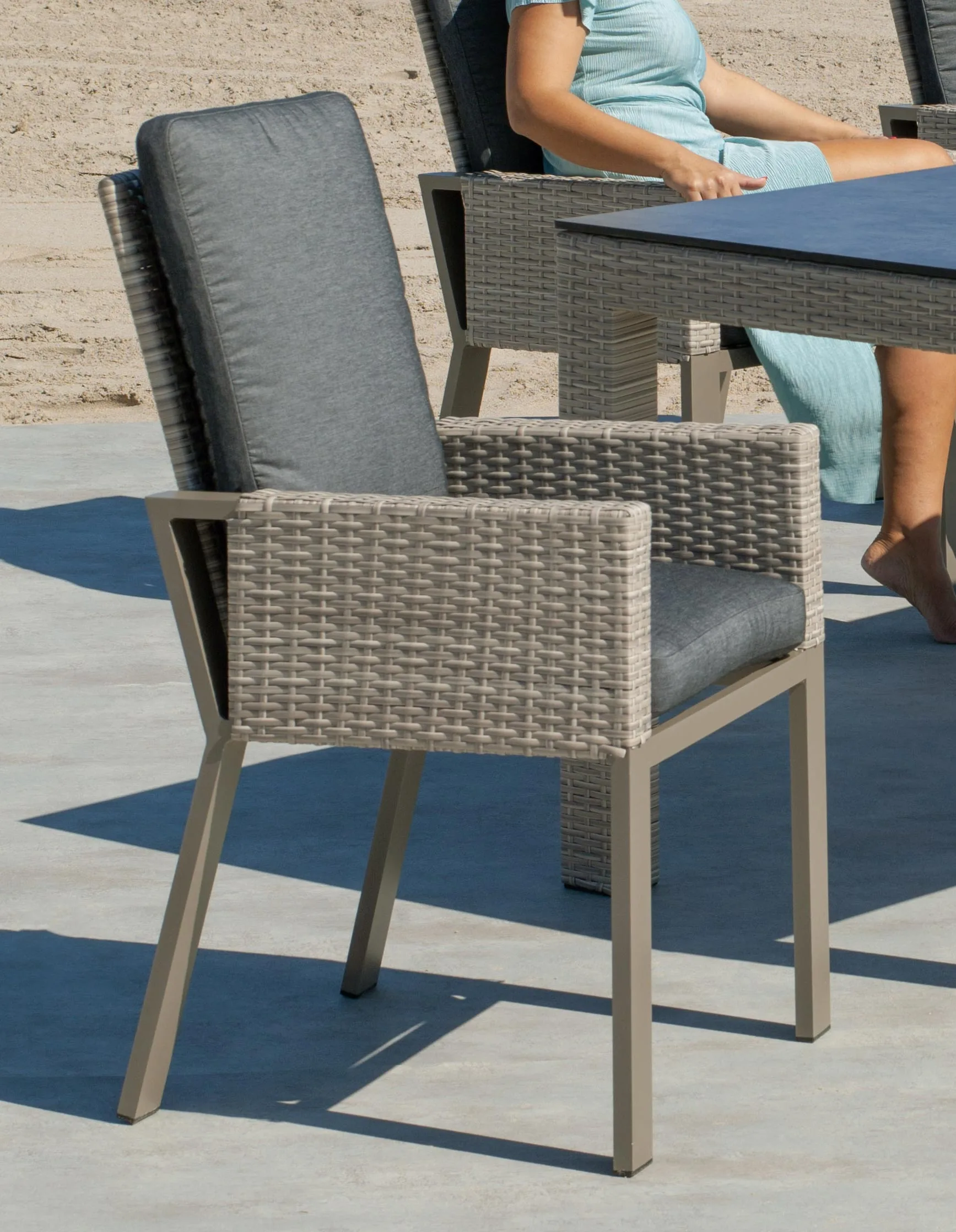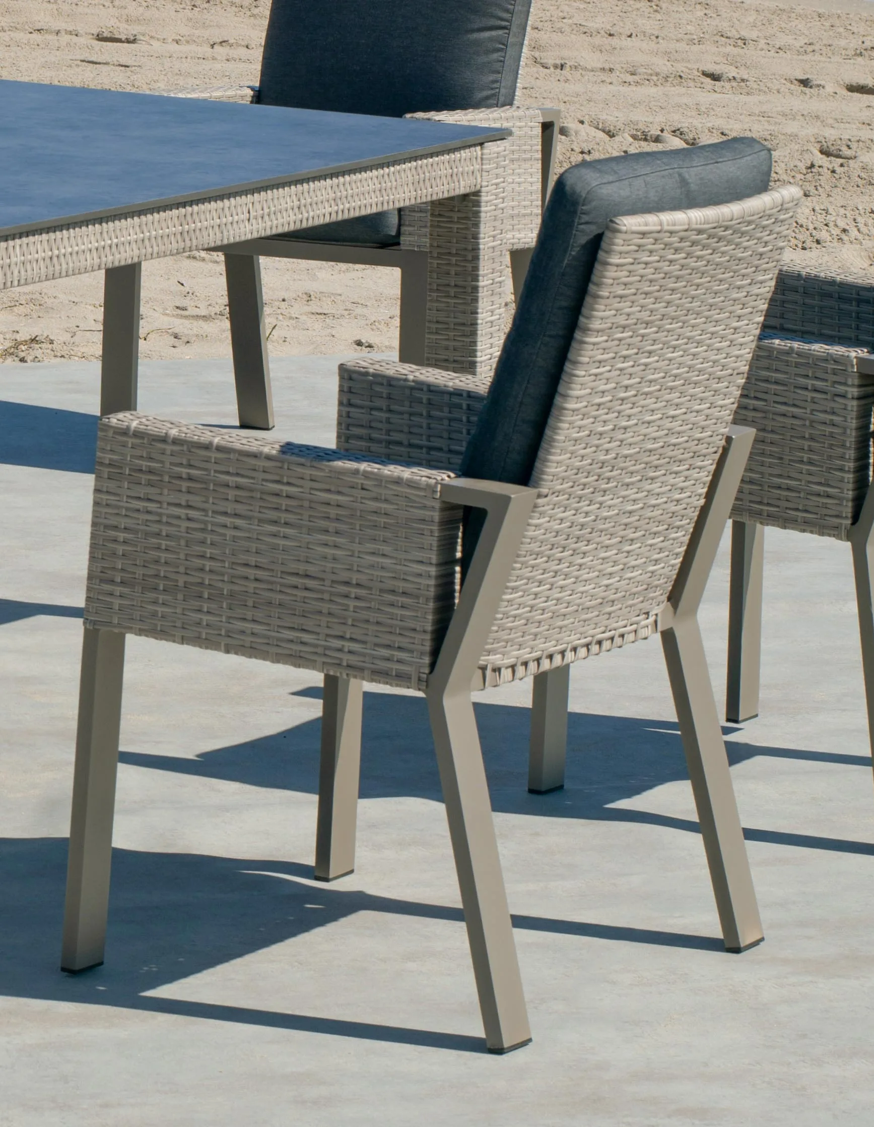 Asiento y respaldo en ratán sintético resistente a la intemperie.