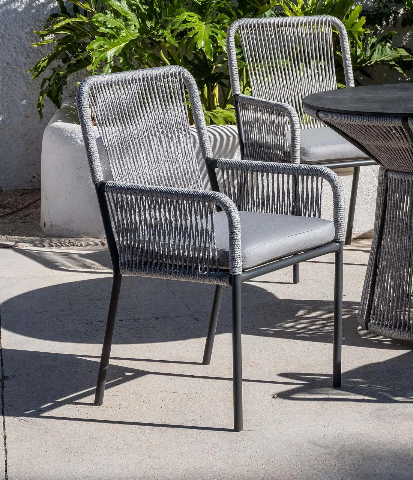 Descubre la silla de exterior moderna que redefine la elegancia: estructura de aluminio anticorrosión y asiento de cuerda trenzada UV-resistente. Con diseño ergonómico y 8 tonos de aluminio + 3 colores de cuerda, personaliza tu jardín, terraza o salón.