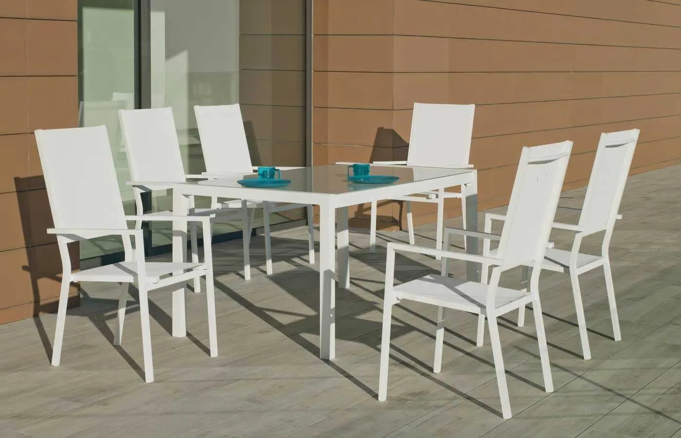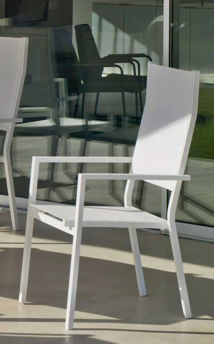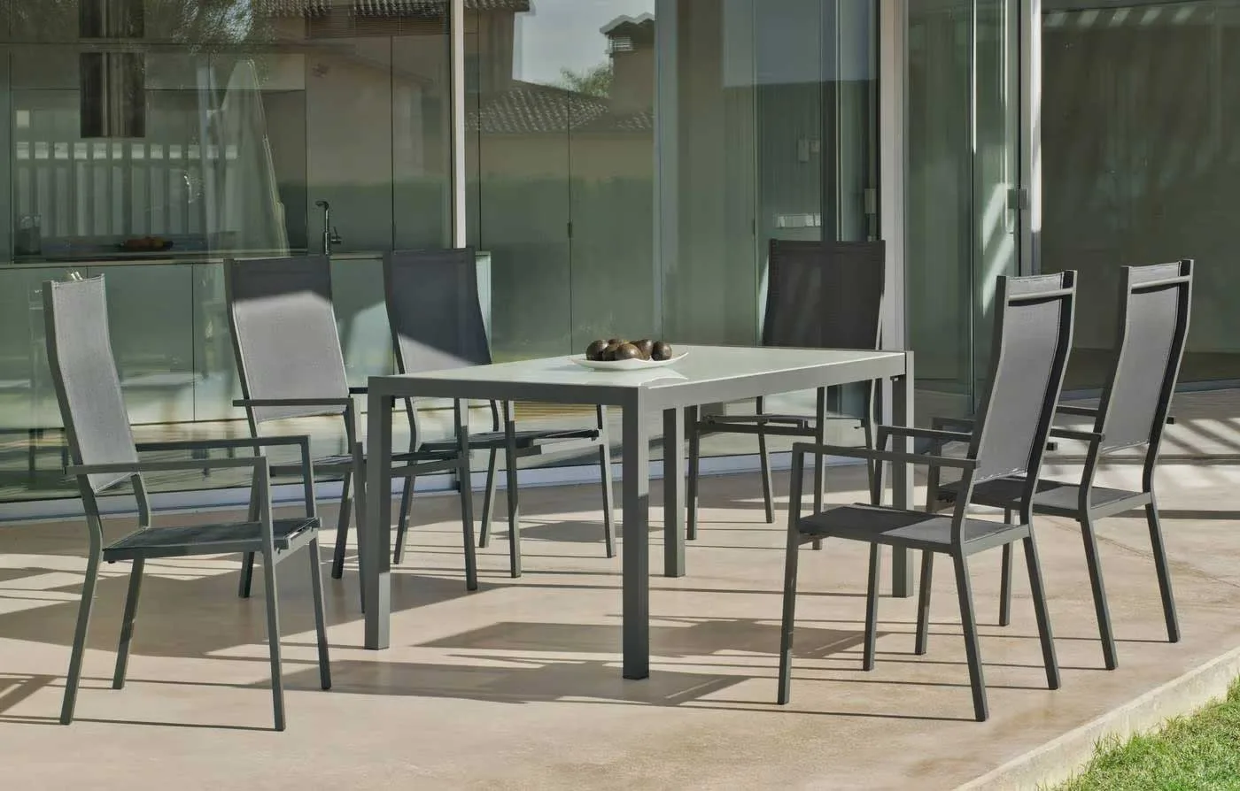 Nuestra silla de jardín de textileno tiene un limpio y original diseño, otorgan a este conjunto de exterior modernidad y elegancia. Especialmente diseñado para soportar las condiciones adversas como el sol y la lluvia, así como los rigores del uso diario. Fabricamos la estructura de aluminio en seis colores distintos; champagne, blanco, marrón, negro, plata y gris antracita.