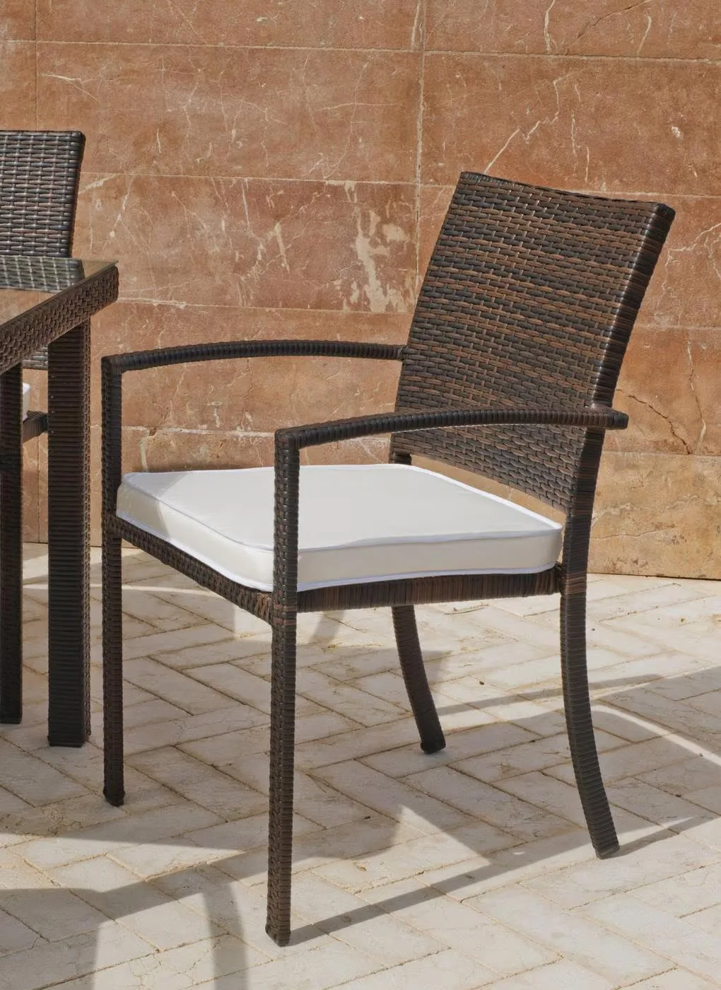 Esta estructura de la silla está cubierta con ratán sintético, se caracteriza por su resistencia, robustez y fácil limpieza. El ratán sintético es un material plástico de polipropileno que imita al ratán natural y que puede resistir más en el tiempo gracias a su reforzado de fibra de vidrio capaz de estar, pasados unos años, tal y como el primer día de su compra.