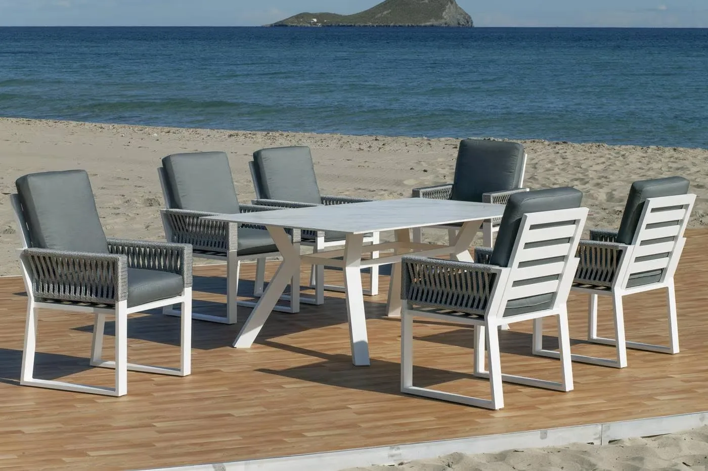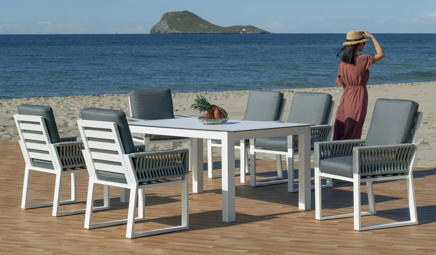 Si estás buscando renovar tu comedor al aire libre y buscas muebles que combinen calidad, estilo y resistencia, entonces tienes que ver nuestro sillón comedor de aluminio y cuerda trenzada. Este tipo de mueble se ha vuelto muy popular en los últimos años, gracias a su estética moderna y elegante, su bajo mantenimiento y su durabilidad.