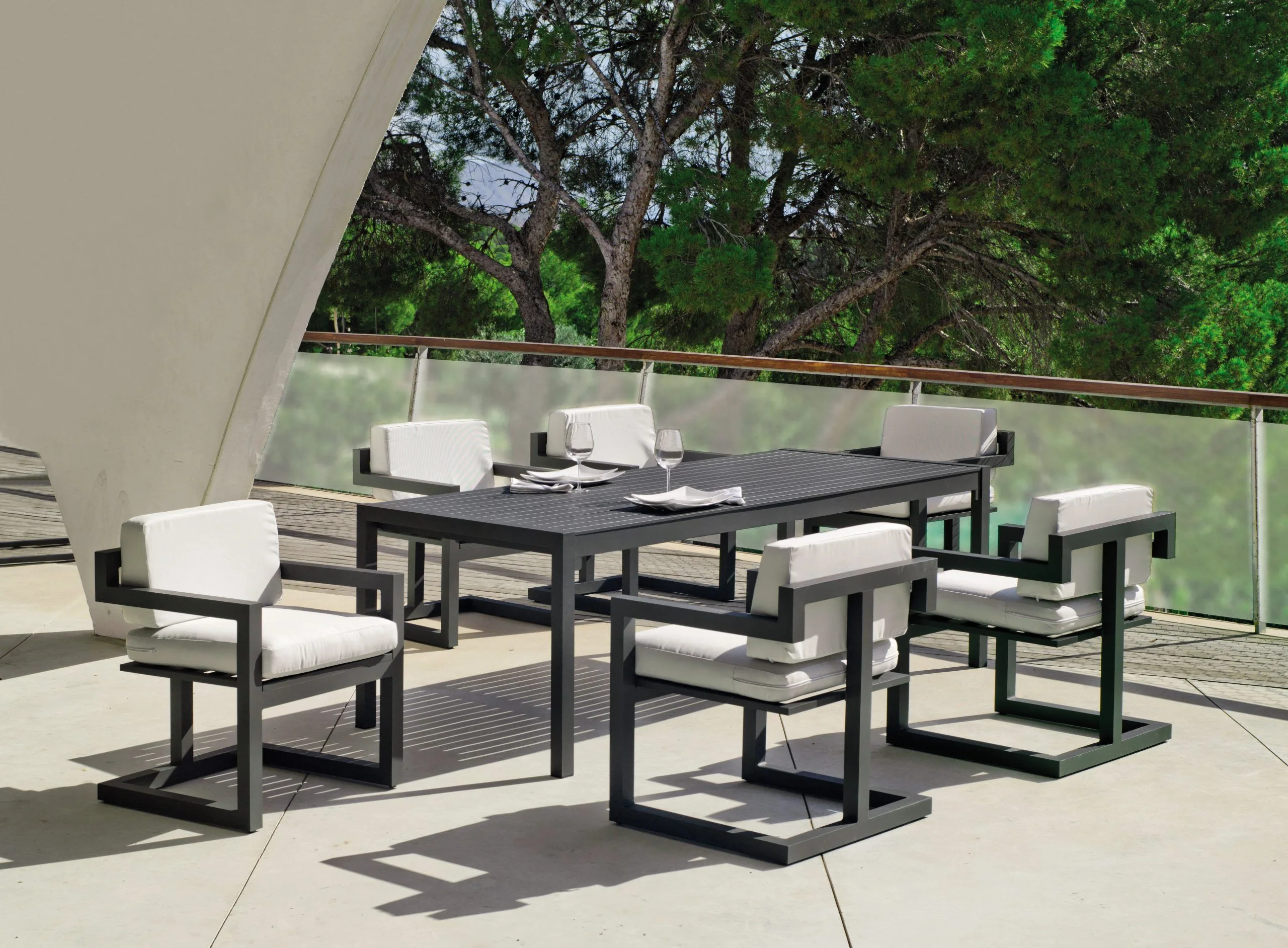 Su limpio y original diseño, otorgan a este conjunto de exterior modernidad y elegancia. Especialmente diseñado para soportar las condiciones adversas como el sol y la lluvia, así como los rigores del uso diario. Fabricamos la estructura de este sillón de jardín en tres colores distintos; champagne, blanco y gris antracita.