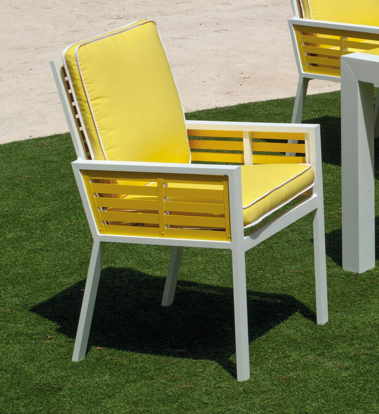 Su limpio y original diseño, otorgan a este sillón, modernidad y elegancia. Especialmente diseñado para soportar las condiciones adversas como el sol y la lluvia de exteriores, así como los rigores del uso diario. Fabricamos la estructura en cinco acabados distintos; champagne/marrón, antracita/blanco, blanco/antracita, blanco/plata y blanco/amarillo.