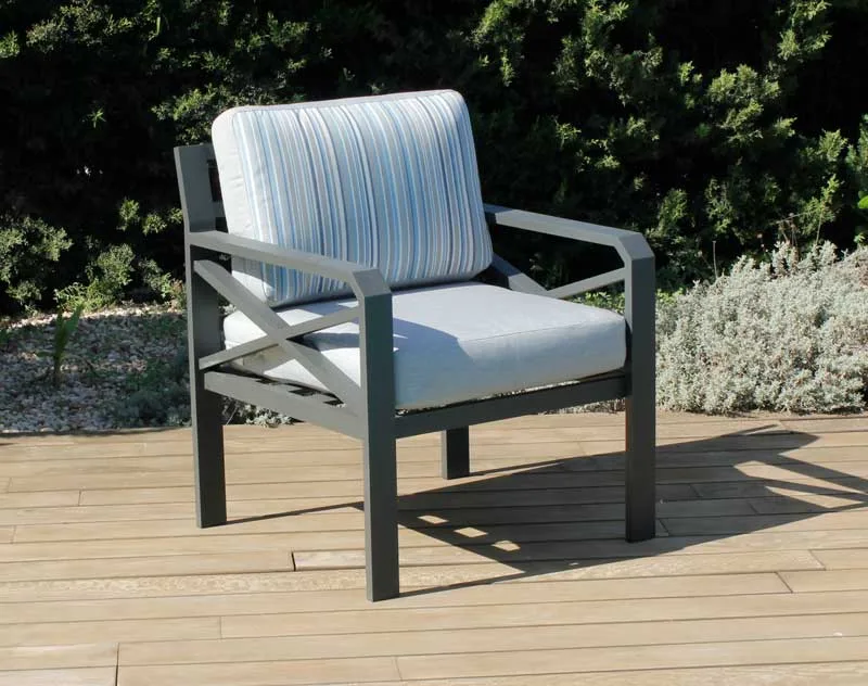 En la fabricación de este sillón de jardín, se han utilizado las mejores materias primas que la hacen muy resistente y duradera. Estructura y uniones fabricadas en aluminio extrusado de alta calidad y no reciclado. Los tubos de aluminio que la forman están perfectamente lijados para eliminar cualquier imperfección o irregularidad en las juntas. Así mismo, dichos tubos están especialmente pulidos para abrir los poros del aluminio y facilitar la fijación de la pintura. Las patas llevan tacos para evitar rallar el suelo y reducir el ruido producido con el movimiento.