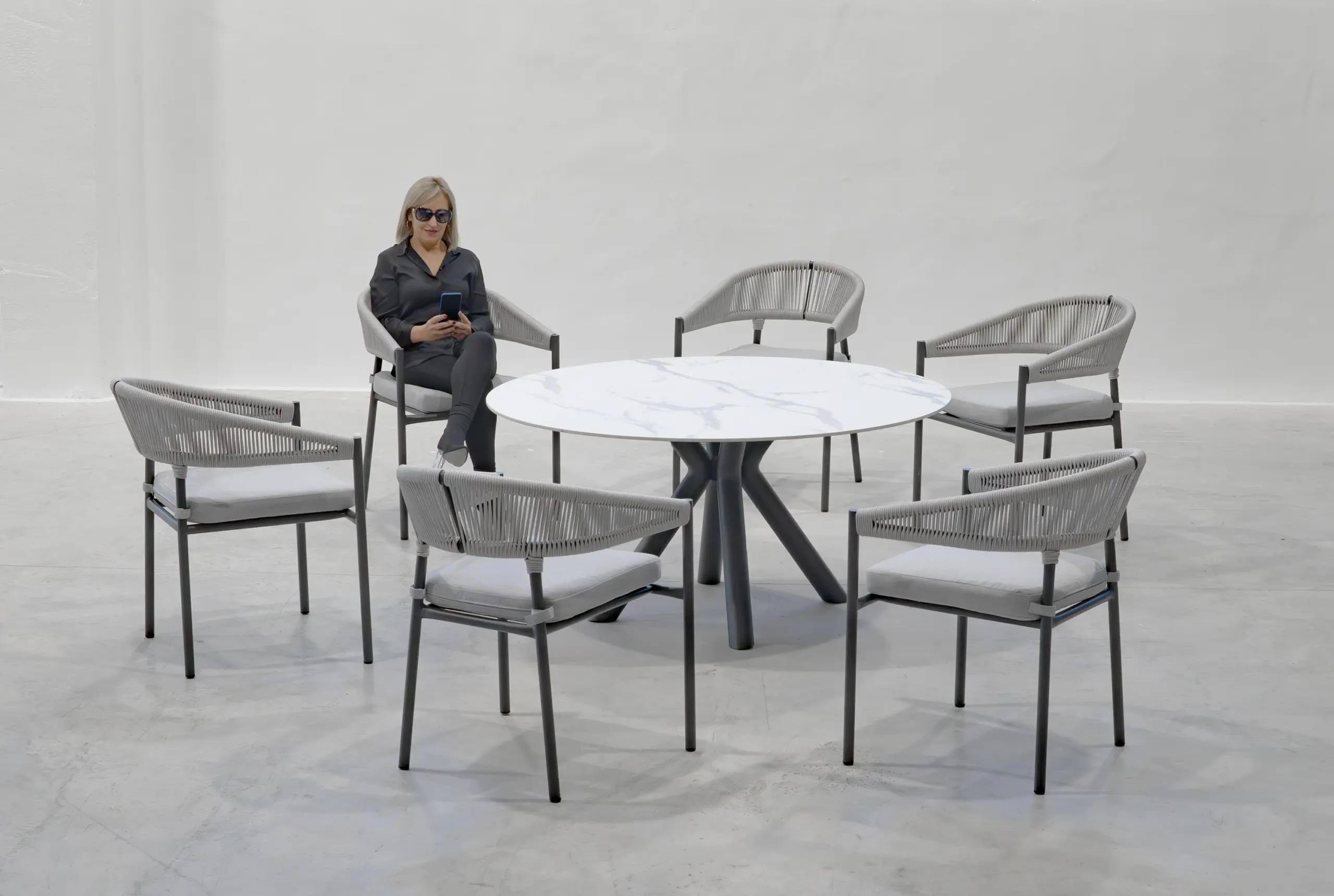 La cuerda trenzada redonda se presenta en 3 elegantes tonalidades, complementando perfectamente la geometría curva del sillón. Los cojines Dralón Lux son desenfundables, repelentes al agua y resistentes a rayos UVA, garantizando durabilidad y confort excepcionales.