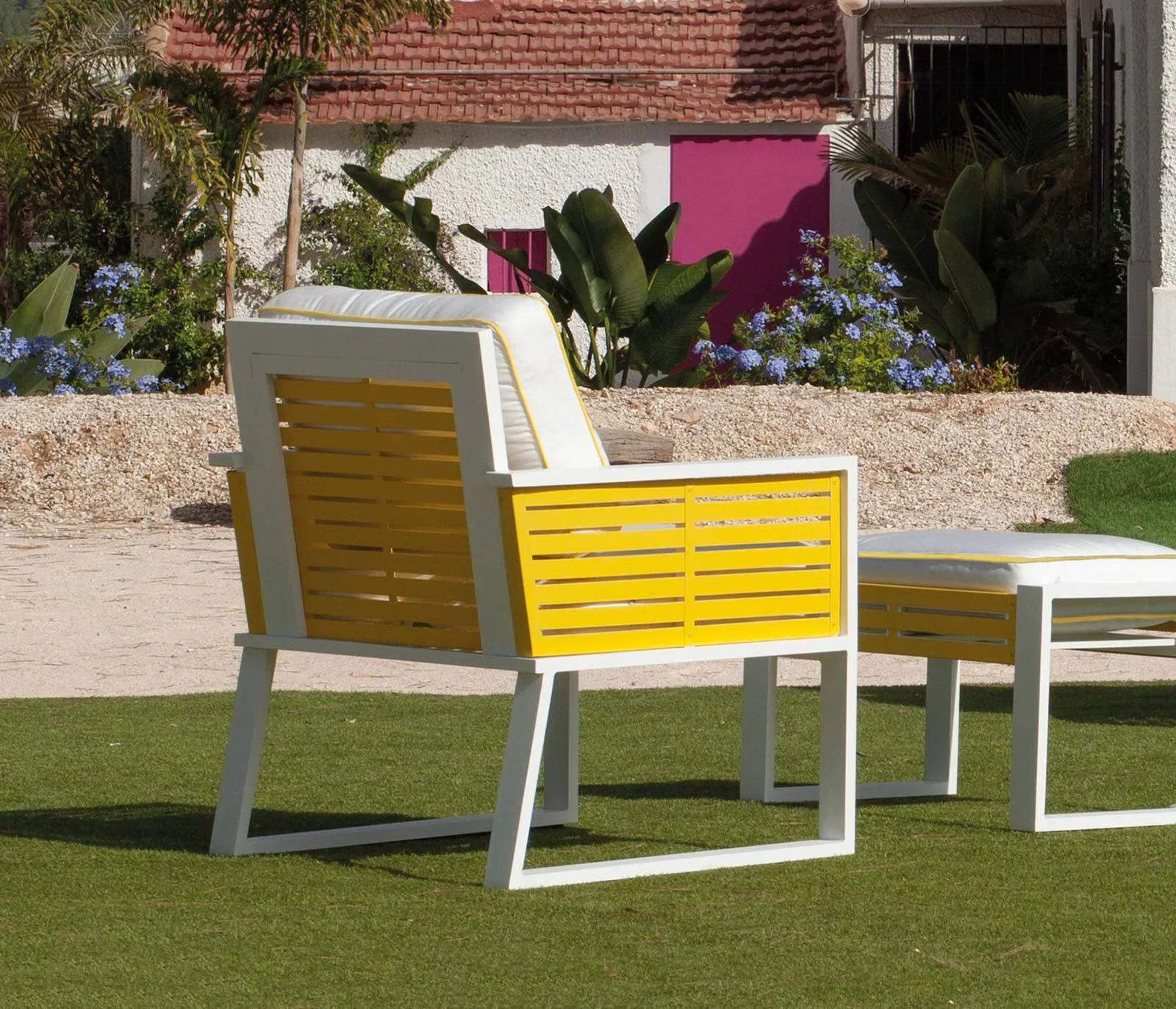 Este sillón de diseño en aluminio bicolor no es solo un mueble, es una pieza de arte para tu hogar. Con cojines tapizados en Dralón Lux de gama alta, ofrece una experiencia de asiento inigualable, perfecta para esos momentos de relax y conversación.