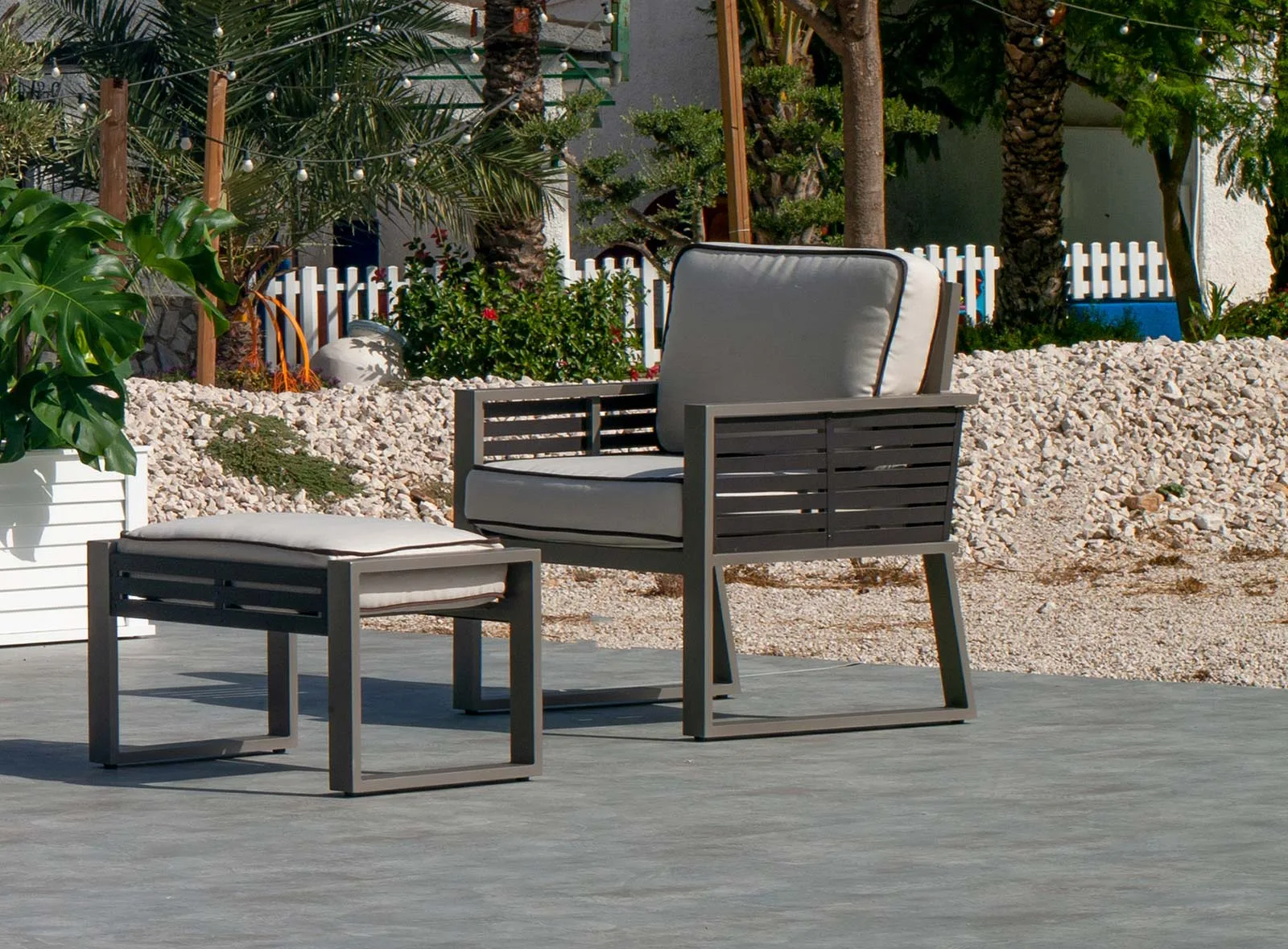 Fabricado con aluminio de primera calidad, este sillón garantiza resistencia y durabilidad. Su estructura bicolor añade un toque moderno y sofisticado, resistiendo a las inclemencias del tiempo y el desgaste diario.
