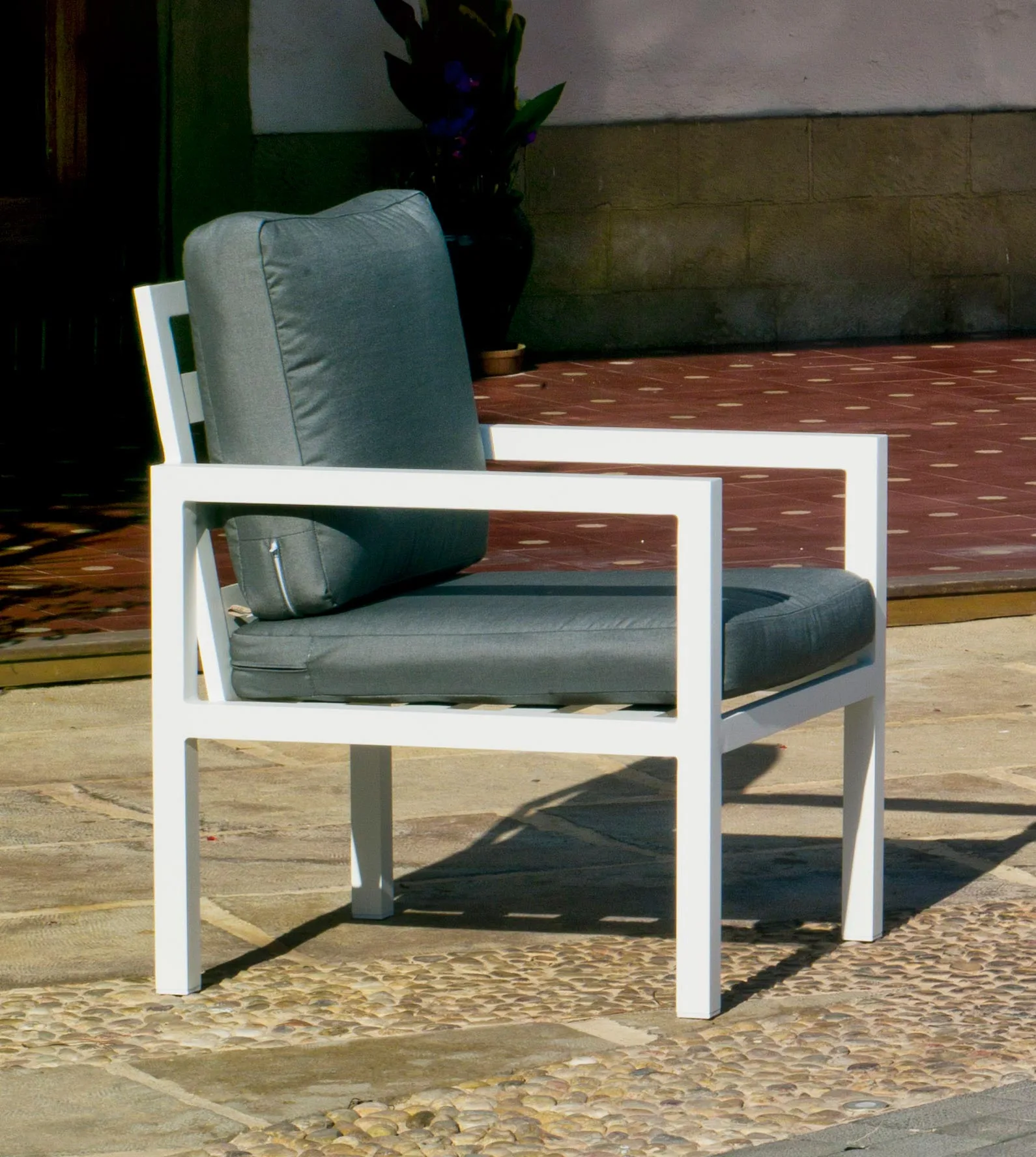 Su limpio y original diseño, otorgan a esta butaca cuadrada modernidad y elegancia. Especialmente diseñado para soportar las condiciones adversas como el sol y la lluvia, así como los rigores del uso diario. Fabricamos la estructura en cuatro colores distintos; champagne, blanco, plateado y gris antracita.
