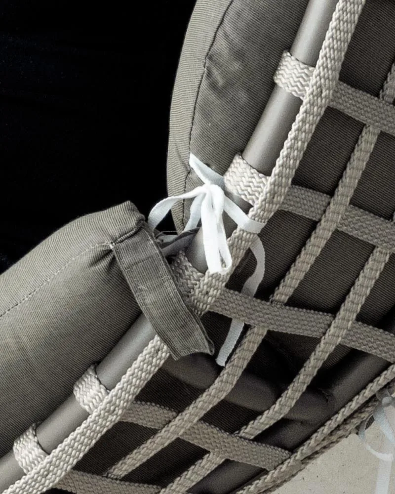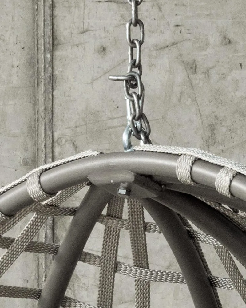 La estructura de este sillón huevo, está revestida de cuerda trenzada en color champagne, azul, blanco o gris antracita. Se trata de una cuerda indeformable e irrompible, resistente a cualquier temperatura. No pierde su forma ni color y está diseñada 100% para su uso en exterior.