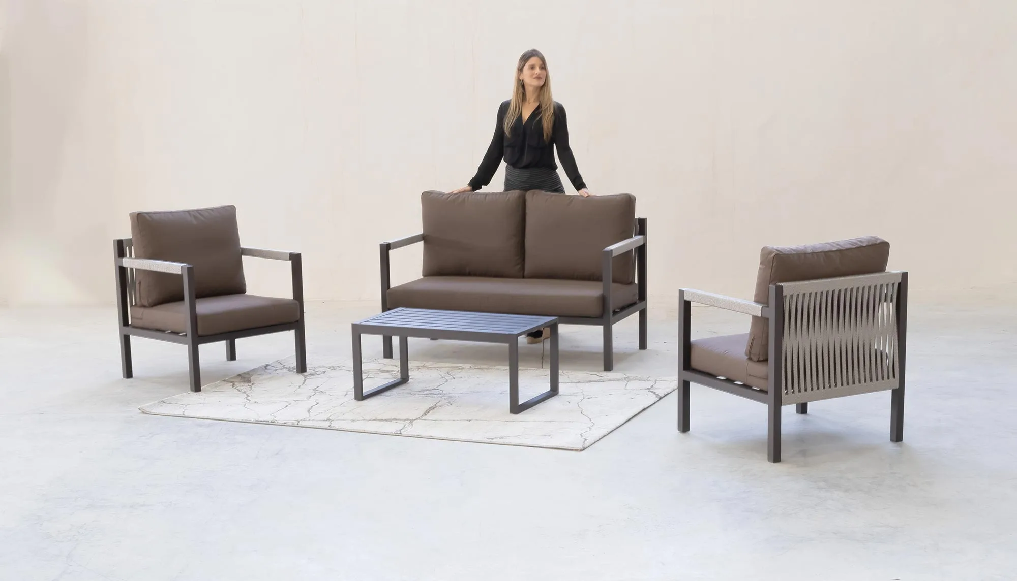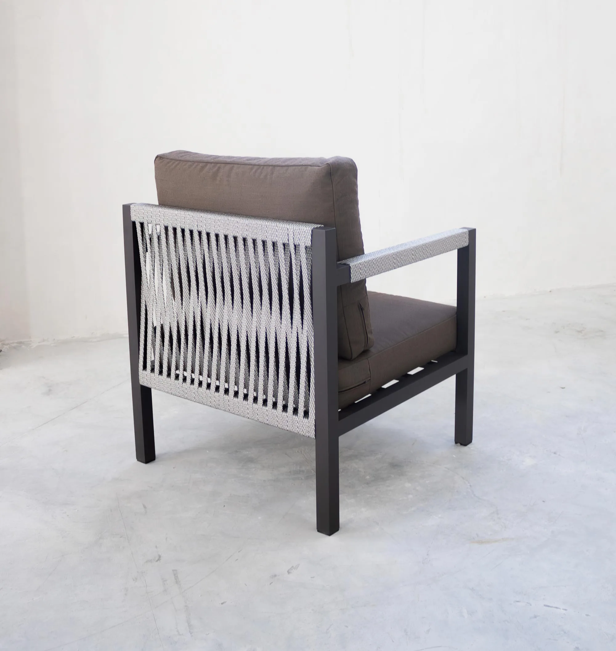 Con seis colores distintos para la estructura de aluminio y múltiples opciones para la cuerda trenzada, las posibilidades de personalización son prácticamente infinitas. Crea un look monocromático elegante o juega con contrastes audaces; la elección es tuya. Esta versatilidad cromática te permite adaptar el sillón a tu estilo personal o a las tendencias cambiantes en diseño de exteriores. Además, la opción de cambiar los cojines te brinda aún más flexibilidad para renovar el aspecto de tu espacio sin necesidad de reemplazar el mueble completo.