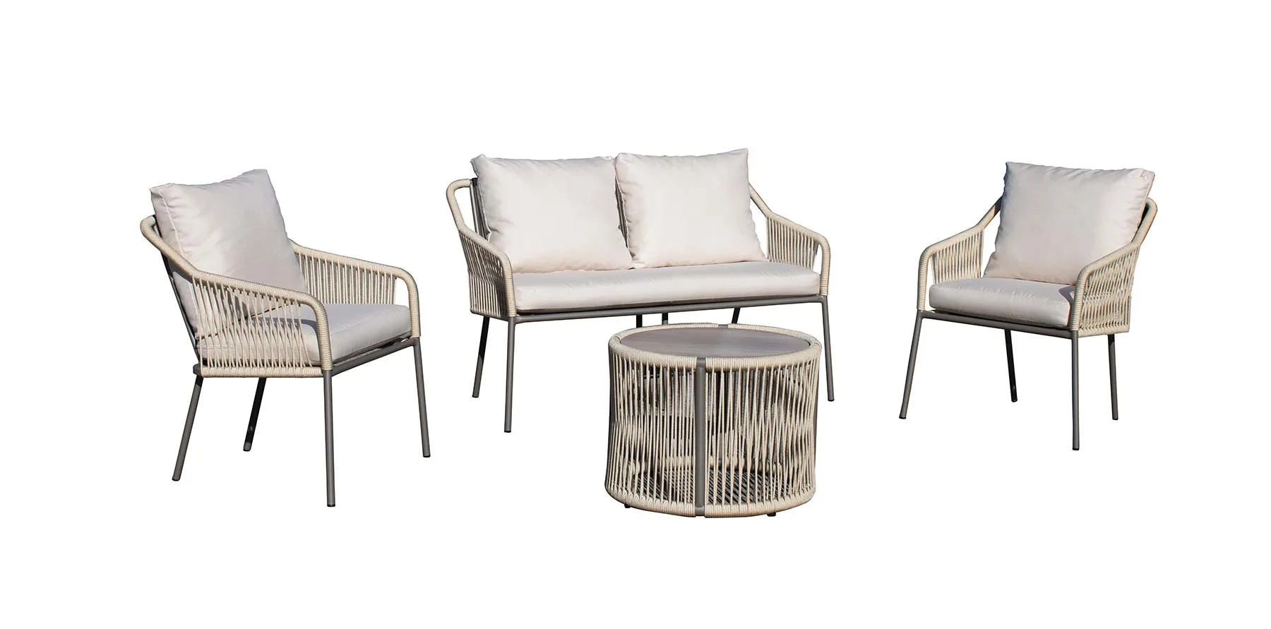 El aluminio utilizado en la estructura no solo es resistente a la corrosión, sino que también es ligero, facilitando la reubicación del sofá según tus necesidades. La cuerda trenzada redonda no solo aporta un aspecto estético atractivo, sino que también es resistente a los rayos UV y a las inclemencias del tiempo, manteniendo su belleza temporada tras temporada.