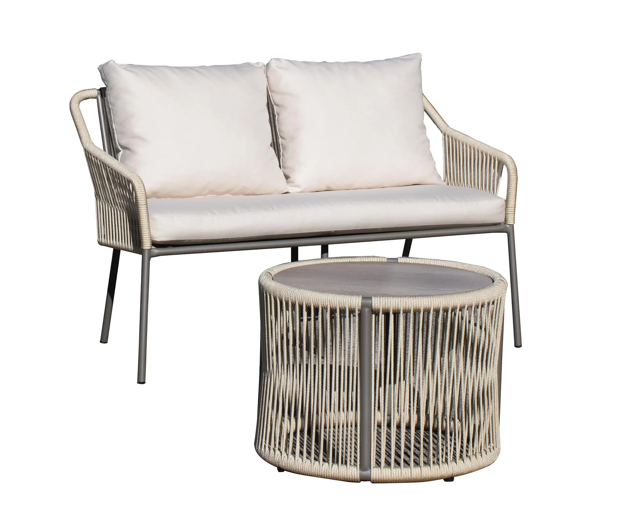 Descubre la elegancia y funcionalidad de nuestro exclusivo sofá de 2 plazas para exterior. Este mueble de jardín combina a la perfección la resistencia del aluminio con la sofisticación de la cuerda trenzada redonda, creando una pieza única que transformará tu terraza o patio en un refugio de confort.