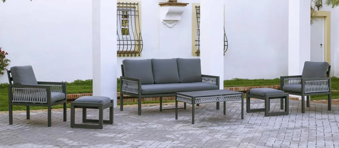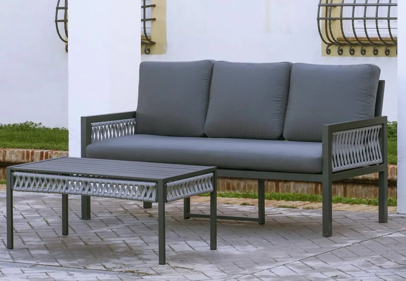 Su estructura de aluminio de primera calidad no solo aporta un toque contemporáneo, sino que también garantiza una resistencia excepcional a las inclemencias del tiempo. La cuerda trenzada que adorna el sofá no solo es estéticamente agradable, sino que también confiere una durabilidad insuperable, resistiendo los embates del sol y la lluvia con gracia inigualable. La tapicería de alta calidad, confeccionada en tejido Dralón, redefine la experiencia de sentarse al aire libre. Cada cojín es una invitación a la serenidad, ofreciendo el equilibrio perfecto entre suavidad y soporte. Prepárate para sumergirte en la comodidad absoluta mientras disfrutas de tu jardín.